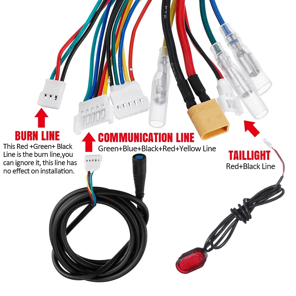 Фара ------ красная + черная линияУскоритель ------ черный + зеленый + красная линияЛиния связи ------ КРУГЛЫЙ портЗадний фонарь ------ красный + черныйЛиния связи ----- зеленая + синяя + черная + красная + желтая линияОжоговая линия ----- Эта красная + зеленая + черная линия является линией ожога, вы можете игнорировать ее, эта линия не влияет на установку.Чтобы подключить два порта, убедитесь, что цвета подключенных проводов одинаковые.Задние фонари должны быть подключены к контроллеру; Фары должны быть подключены к счетчику.Код ошибки и решения: