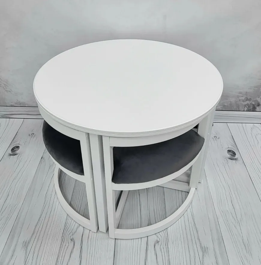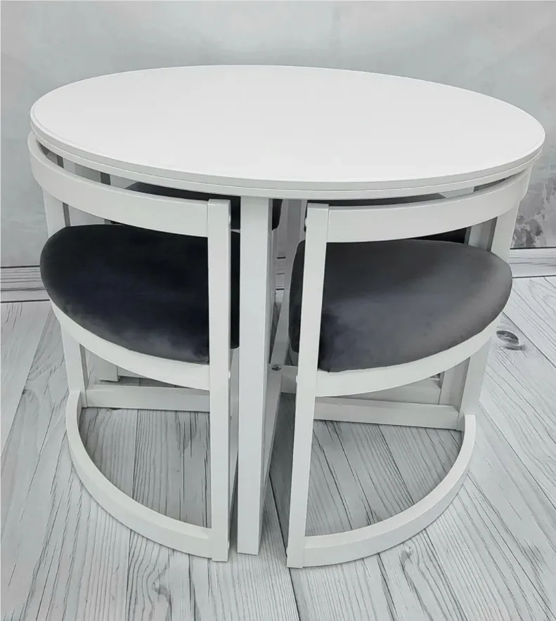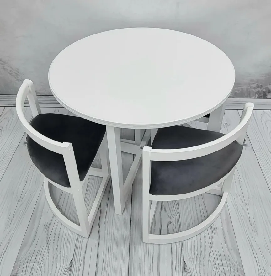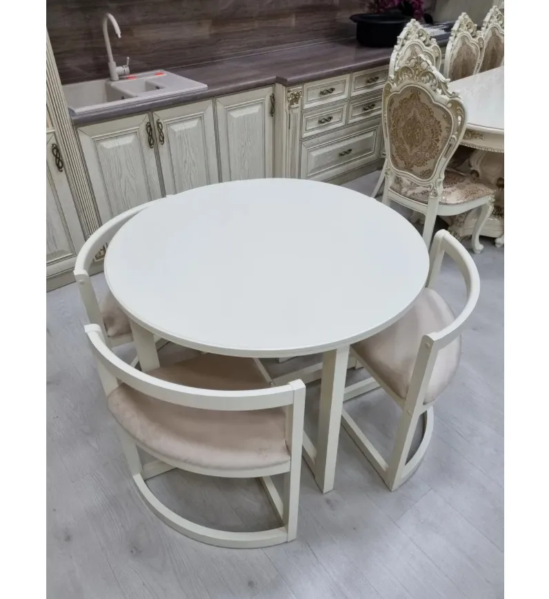 Очень удобный однотонный комплект из бука: стол + 4 стула. Идеально подходит для небольших комнат и квартиры, а также для кухни, столовой, террасы или чердака. Компактность достигается благодаря тому, что стулья полностью убираются под столом. В процессе производства используются высококачественные экологически чистые материалы от ведущих производителей. Ткань на стульях-высококачественный велюр. Для заказа или в наличии имеются также овальные обеденные группы для 6 человек. Внимание! Набор разделен на 2 изделия: стол и стулья, но продается только в комплекте.