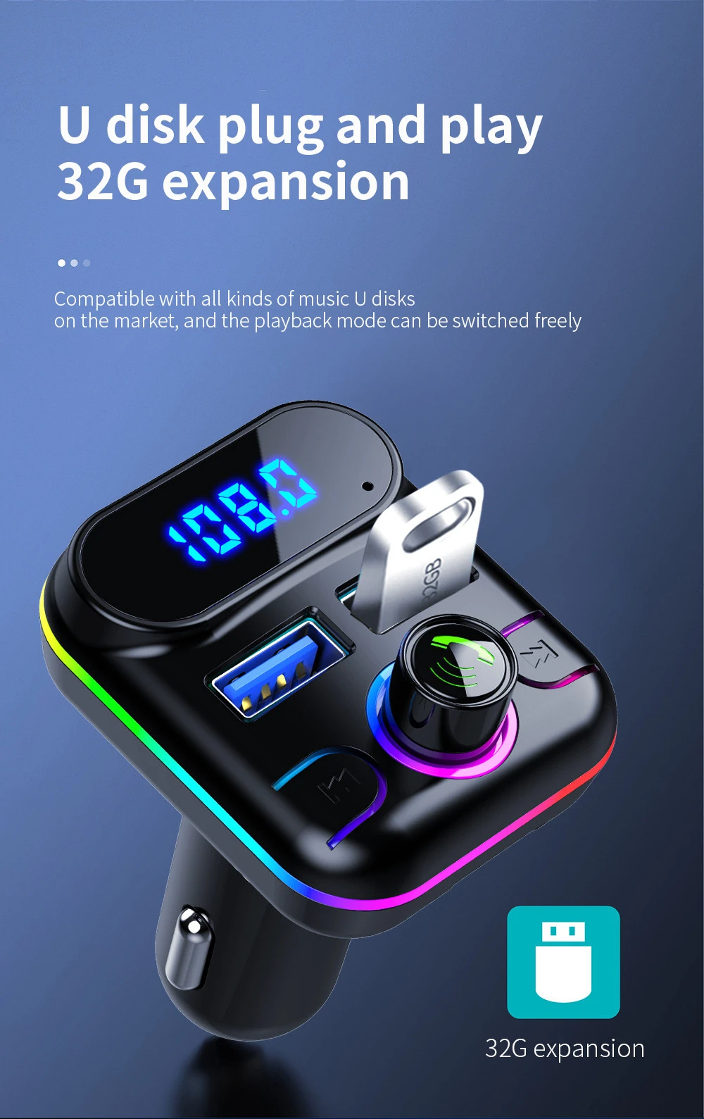 Автомобильный Bluetooth 5,0 FM передатчик двойной USB PD Тип C быстрая зарядка автомобильное зарядное устройство синий...Купить сейчас