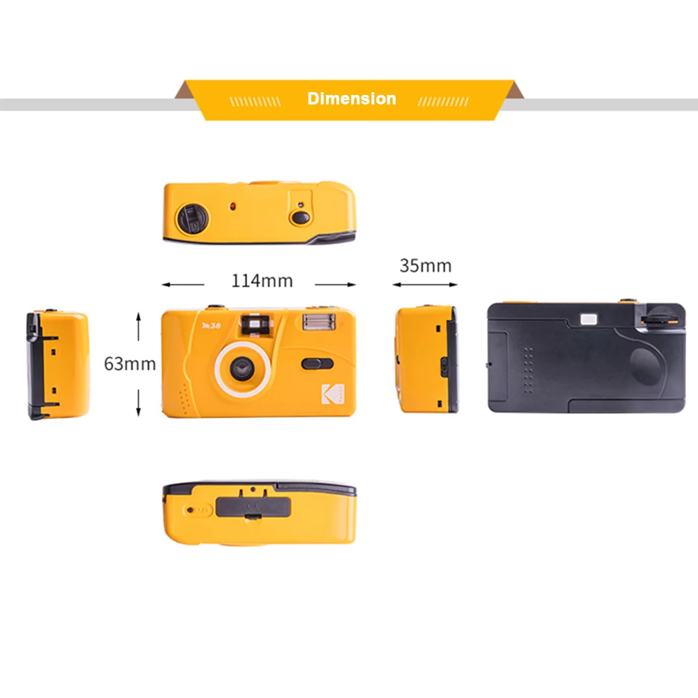 Kodak M38-это многоразовая пленочная камера с пленкой размером 35 мм. Так же, как это диапазон одноразовых камер, M38 имеет объектив с фиксированным фокусом, ручную намотку пленки, перемотку и переключатель для включения/выключения вспышки. Просто Приобретите рулон пленки 35 мм и загрузите его, сделайте свои фотографии, перемотайте и возьмите рулон пленки для разработки в магазинах для создания фотографий.