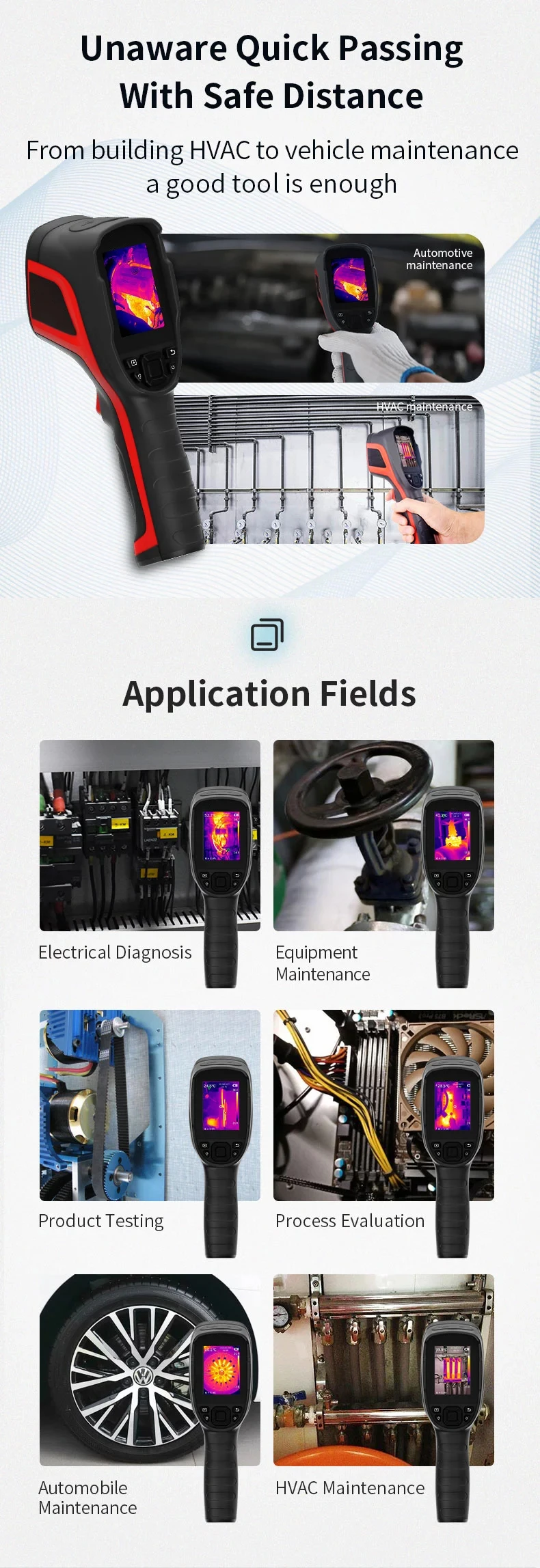 12. Широкий спектр применения: электрическая диагностика, техническое обслуживание оборудования, тестирование продукта, оценка процесса, техническое обслуживание автомобиля, HVAC техническое обслуживание, обнаружение тепла пола