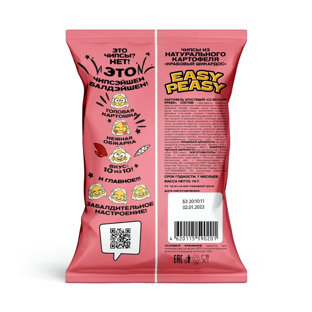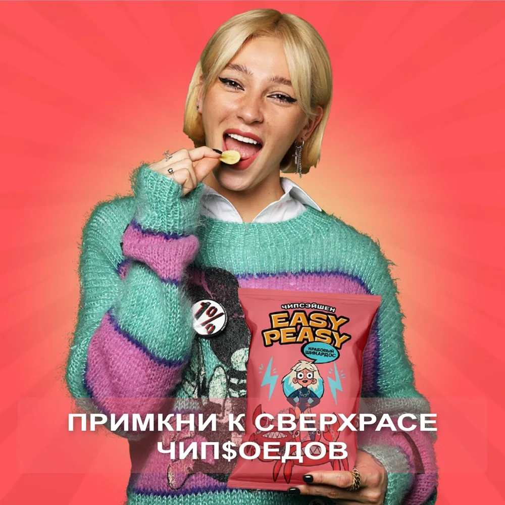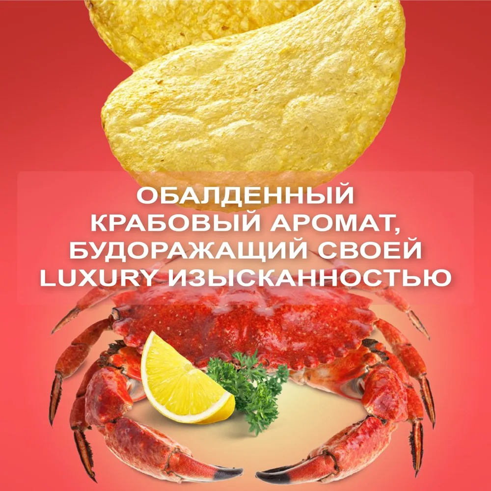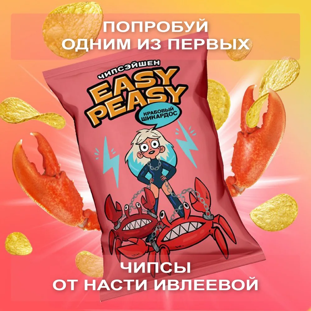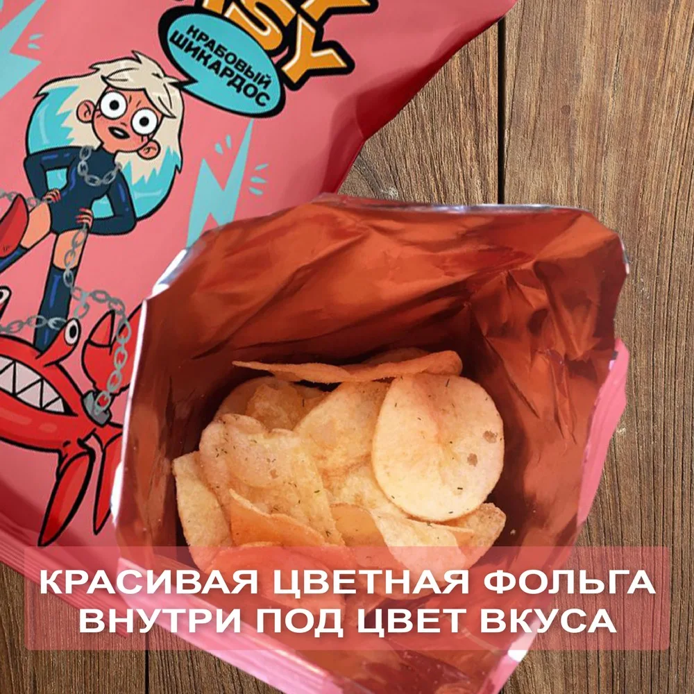 Обалденный крабовый аромат, будоражащий своей luxury изысканностью. Картофельные чипсы премиального качества по доступной цене. Созданы из топовой российской картошки и специй от ведущего немецкого производителя. Нескучный и модный дизайн, с которым не стыдно сделать селфи и устроить перекус ) Только у нас - красивая цветная фольга внутри под цвет вкуса. Одним словом , вкус, дизайн, упаковка - все для забалдительного настроения! А разве может быть иначе? Ведь это необычные чипсы от Насти Ивлеевой )