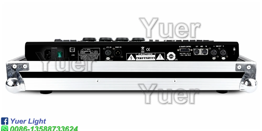4 выхода DMX, 15 исполнительных фейдеров (длина 60 мм), 45 кнопок Исполнительный фейдер, 6 кнопок страниц (канал/фейдер/кнопка).
