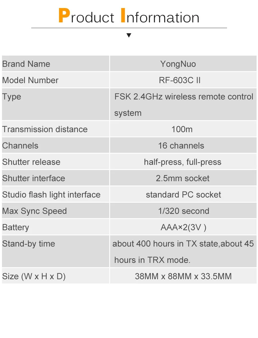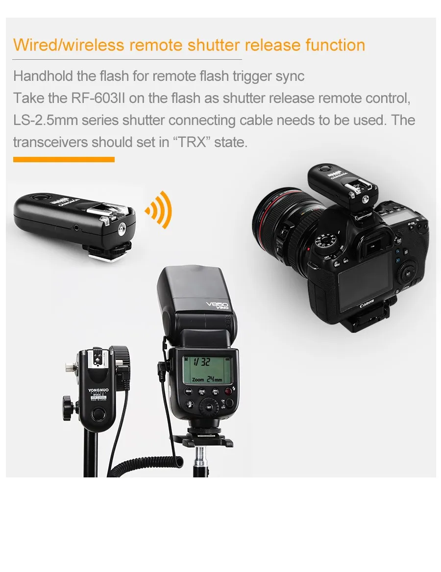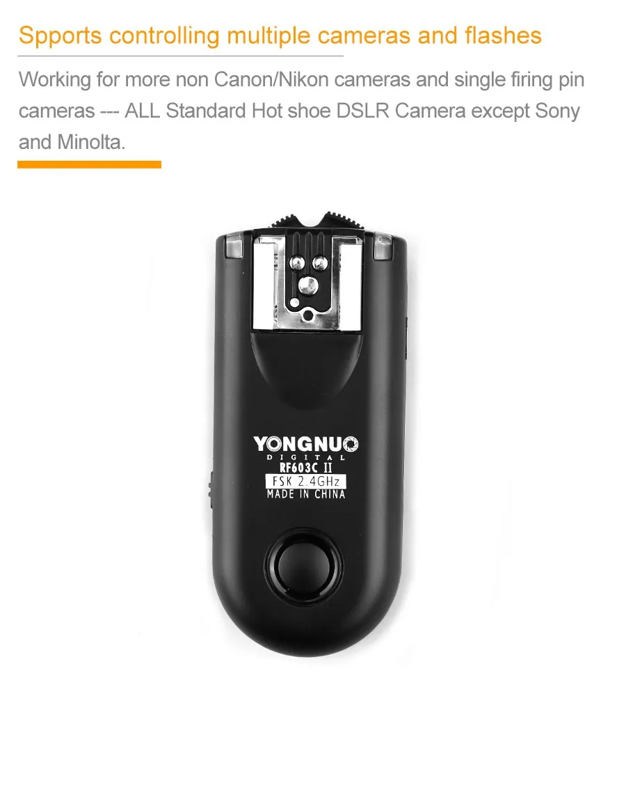 YONGNUO RF-603 II триггер вспышки 2 трансивера набор спуска затвора для Canon RF-603 II C1 C3 RF-603 II, ручная вспышка триггера и спуск затвора (вы можете использовать эти две функции одновременности), он принимает Глобальный Бесплатная доставка по всему миру FSK 2,4 ГГц беспроводной канал, который может быть пригоден во многих странах. RF-603 II с системой FSK, может быть более эффективным, чтобы гарантировать скорость, расстояние и стабильность. В емких областях расстояние дистанционного управления может достигать 100 м и подходит для первого поколения RF-603.Suit первого поколения, вы можете использовать их вместе.Примечание: Canon camera s choose RF-603 II версия Canon, Nikon Camera Chose RF-603 II версия Nikon, другие камеры s могут выбрать любую версиюRF-603 II C1 триггер вспышки для Canon Rebel 300D/350D/400D/450D/500D/550D/1000D серииRF-603 II C3 триггер вспышки для Canon 10D/20D/30D/40D/50D/1D/1D Mark II/1D Mark III/1D Mark IV/ 1Ds / 1Ds Mark II /1Ds Mark III /5D/ 5D Mark II/5D Mark III /1DX/ 6D/7DБолее высокая скорость синхронизации, чем первое поколение --- самая высокая скорость синхронизации вспышки до 1/320 секунды (некоторые модели могут достигать только 1/250 с или меньше, разница в сочетании моделей вспышки и использования камеры может достичь разницы в скорости синхронизации).Добавление фиксирующих колецУлучшенные кнопки управления вспышкой/затворомРаботает для большего количества камер Canon/Nikon s и одиночной контактной камеры s --- все стандартные DSLR камеры горячего башмака, кроме Sony и Minolta.Добавление выключателя питания для одного передатчика --- установите переключатель питания на TX (одиночная передача) или TRX (автоматический переключатель передачи) в соответствии с различными требованиями к съемке. Когда он используется в качестве беспроводного передатчика запуска и тестирования вспышки, установите в «TX»; Когда он используется в качестве беспроводного приемника запуска, с помощью спуска затвора или других расширенных функций, установите в «TRX». Включение в выключение означает выключение питания.RF-603 II N1 триггер вспышки для D800/D700/D300/D2X/D2H/D200/D1H/D1X/D3X/D3RF-603 II N3 триггер вспышки для Nikon D7000 D5100 D5000 D3100 D90 D600RF-603II принимает Глобальный Бесплатная доставка по всему миру FSK 2,4 ГГц беспроводной канал, который может быть пригоден во многих странах.Расстояние дистанционного управления может достигать 100 м и подходит для RF-603I.Этот беспроводной комплект триггера вспышки состоит из двух одинаковых трансиверов. Он может быть установлен в одно состояние передачи (TX), что будет более удобным для тестирования вспышки, и может быть установлен в состояние трансивера (TRX), автоматически переключается передача и получение состояния, принимает 2 кнопки рычага, он воплотит в жизнь пробуждение, тестирование вспышки, фокусировку и функцию затвора в «TX» И "TRX" Состояние соответственно.Передатчик поддерживает запуск с одним контактом, поддерживает беспроводное включение и запуск вспышки через? Горячий башмак для камеры, со специальным кабелем для подключения затвора камеры, может реализовывать проводной/беспроводной пульт дистанционного управления спуском затвора, Поддерживает одновременное управление несколькими камерами и вспышками.Максимальная скорость синхронизации вспышки до 1/320 секунд (некоторые модели могут достигать только 1/250 с или меньше, разница в сочетании моделей вспышки и использования камеры может достичь разницы в скорости синхронизации вспышки.)