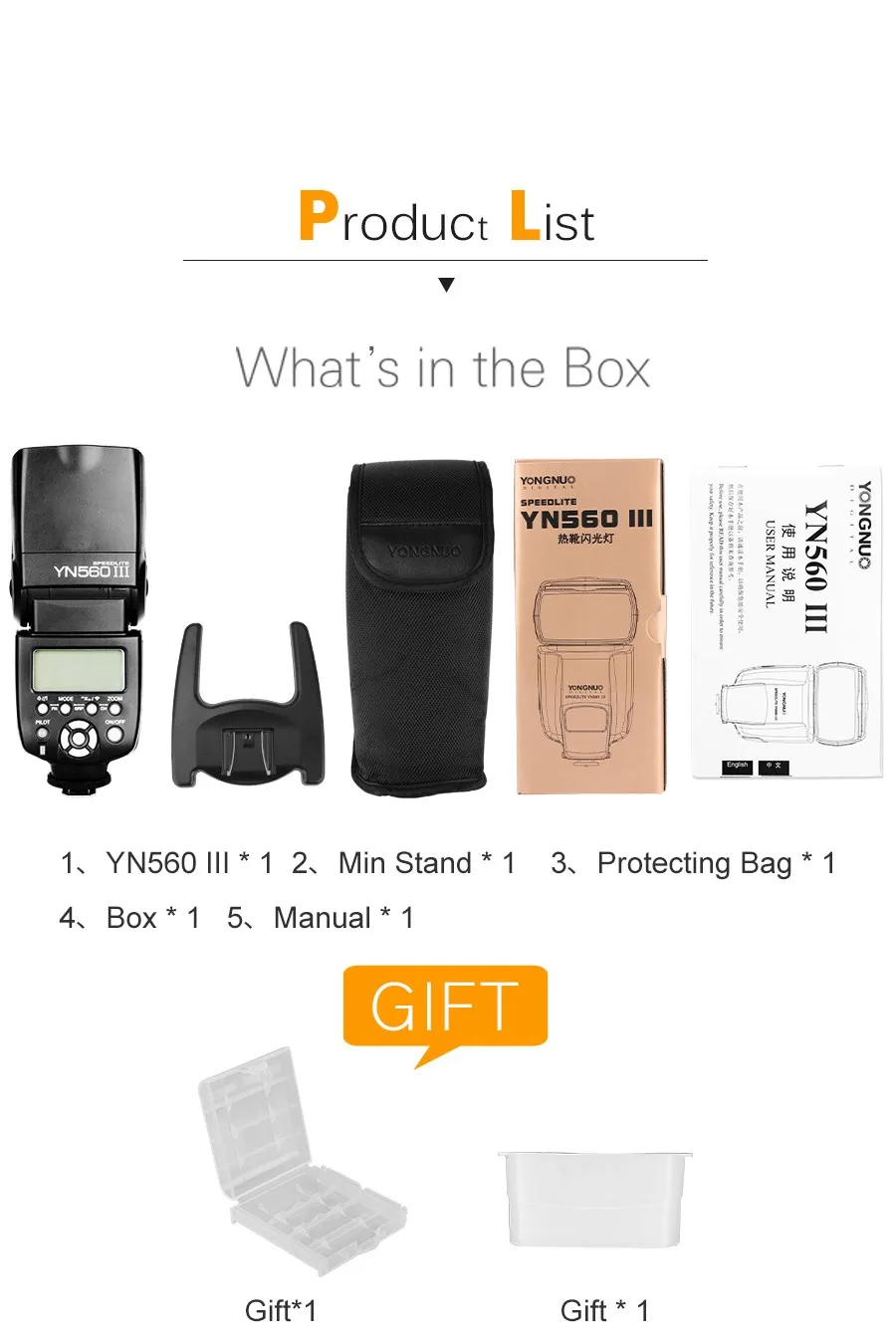 Посылка включает:1 x YN-560 III1 мини-подставкаЗащитный мешок-1 шт.1 х Руководство1 x оригинальная коробка