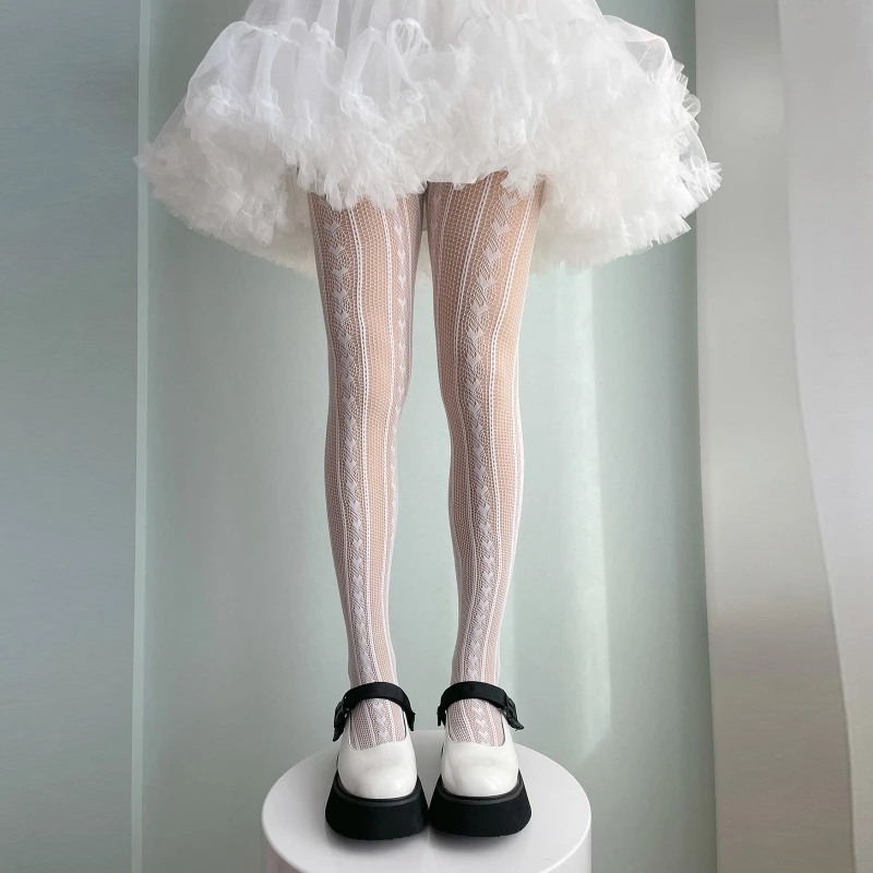 Готический стиль, ажурные сетчатые колготки, милые жаккардовые колготки в вертикальную полоску с сердечками.