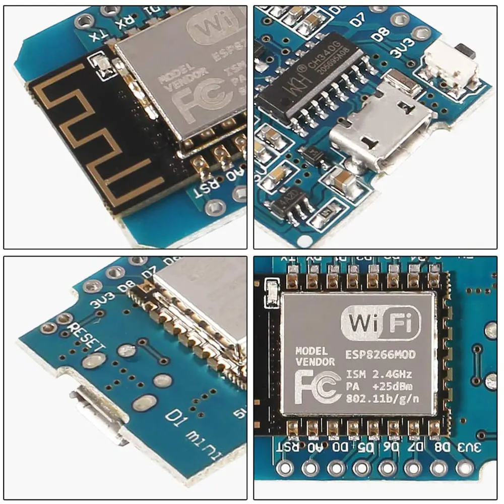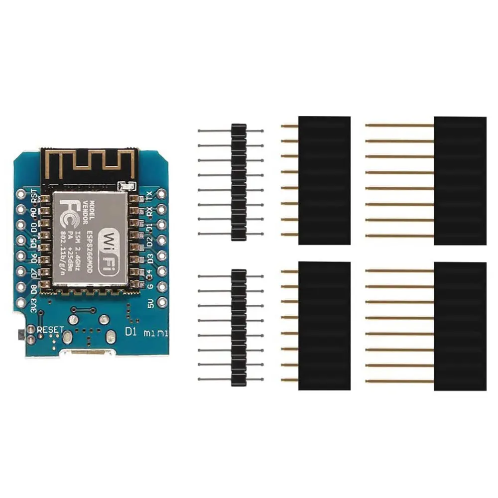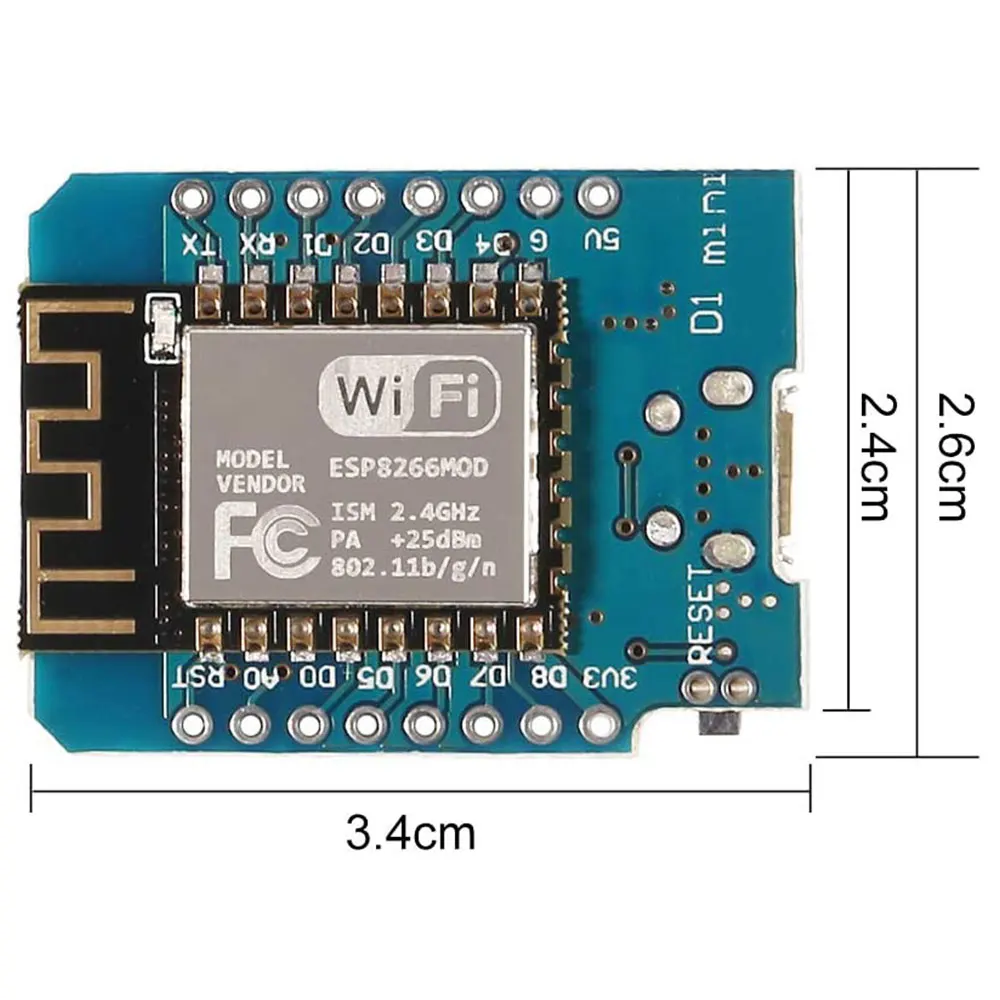1 analog input(3.3V max input) a Micro USB connectionPackage Included: 1×WeMos D1 mini 2×Long female pins 2×Short female pins 2×Normal pins