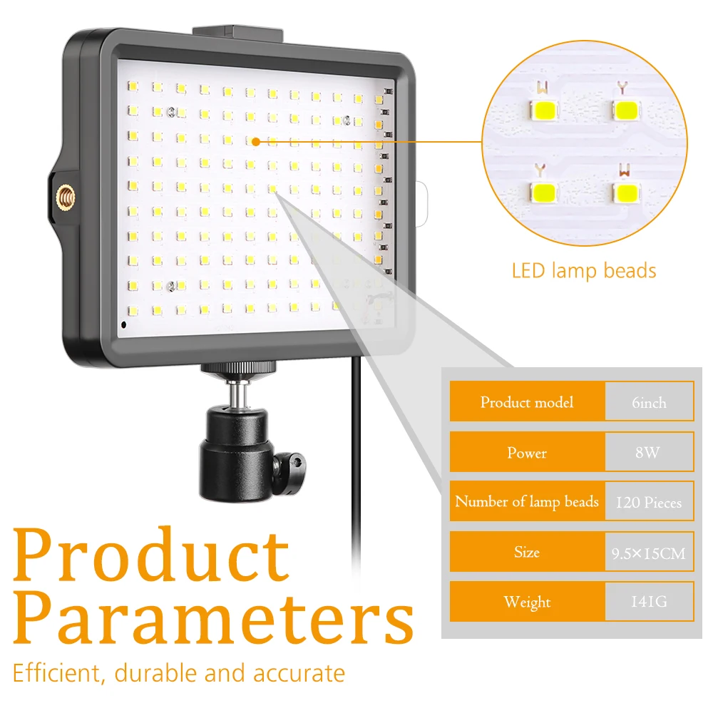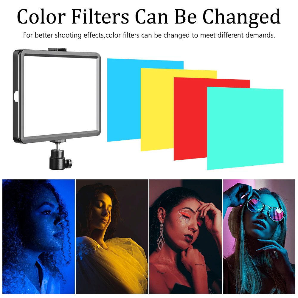 Светодиодное настольное Видео Освещение со штативом оснащено цветными фильтрами 1*4 (красный, оранжевый, голубой, синий), которые могут удовлетворить различные требования к фотографии и визуальные эффекты, И подходит для видео на YouTube, фотографии продукта, видеоконференций, онлайн-курсов и т. д.