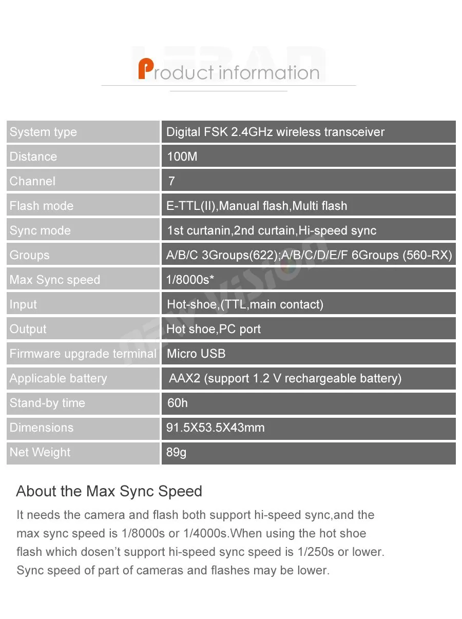 Удаленно меняйте режимы и параметры вспышки быстро при использовании DSLR камер Canon EOS серии, которые поддерживают функцию внешней вспышки, например TTL ratio или вручную устанавливают каждую группу флэш-выхода. Поддерживает высокоскоростную синхронизацию, максимальная скорость синхронизации-1/8000 с *, поддерживает E-TTL, ручные и мульти Режимы вспышки. Поддержка E-TTL установки вспышки в верхней части передатчика.