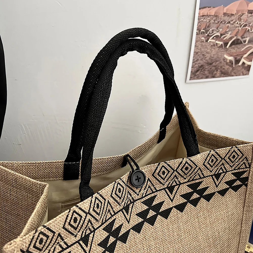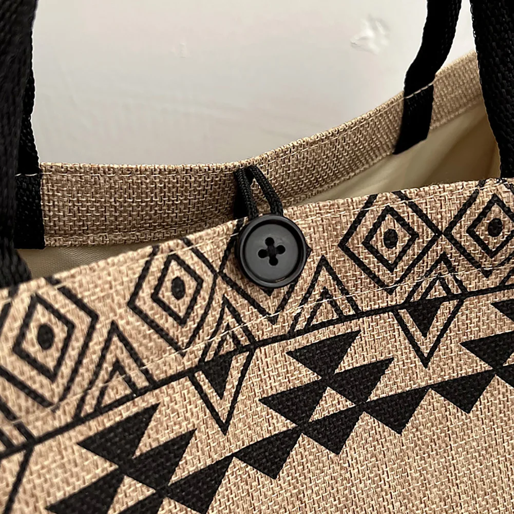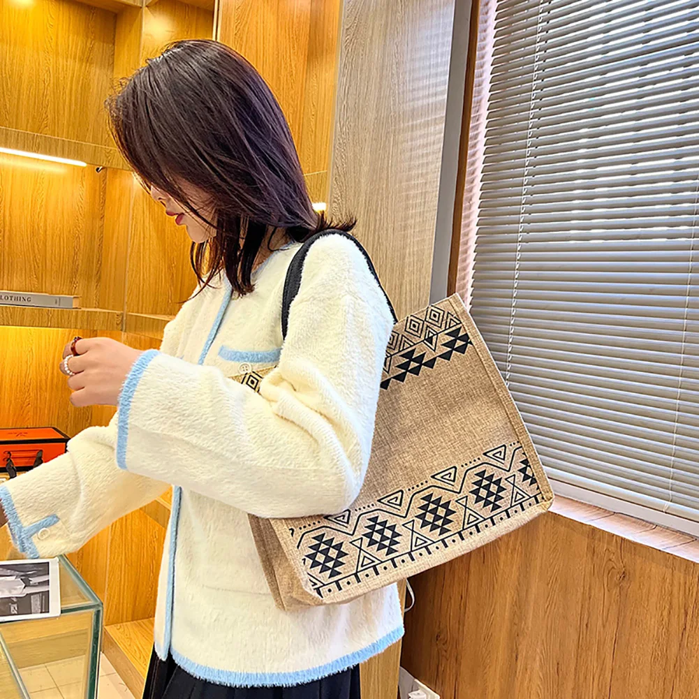 Женская винтажная Льняная сумка-тоут с геометрическим узором, Женская Большая вместительная сумка через плечо, Многоразовые Джутовые Сумки для покупок