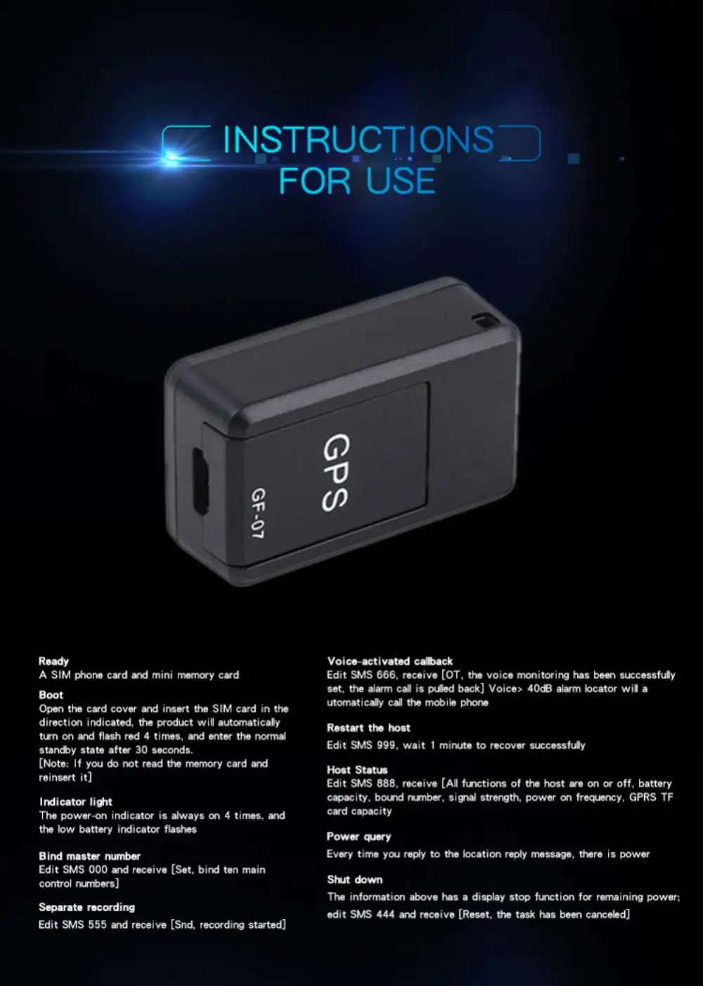 1. Использование:Независимо от того, находится ли локатор сигнализации в машине, детских школьных сумках, карманах для пожилых людей или сумке для ценностей, вы можете отправить sms-инструкции на локатор сигнализации на мобильный телефон, чтобы узнать о местоположении локатора сигнализации, Что удобно для вас, чтобы контролировать весь процесс и захватывать местоположение цели в режиме реального времени.