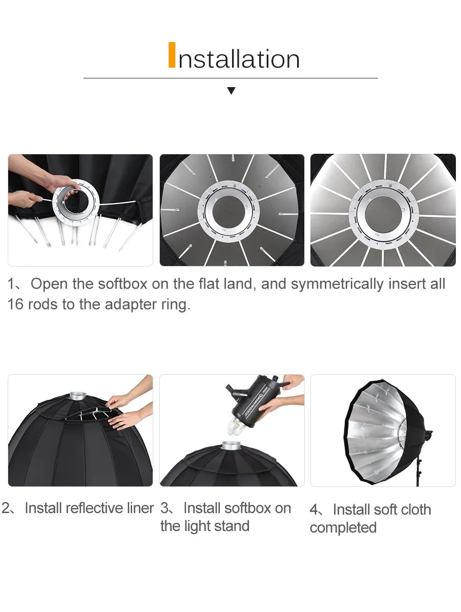 Методы установки1. Откройте софтбокс на плоской поверхности и симметрично вставьте все 16 стержней в кольцо адаптера.2. Установите отражающую подкладку: вставьте подкладку в кольцо, прежде чем наклеить ее в софтбокс.3. Установите внутренний диффузор: Откройте диффузор и установите его на внутренние кнопки софтбокса один за другим.4. Установите внешний диффузор: Откройте диффузор и равномерно приклейте его к краю софтбокса.5. Установите софтбокс на подставку-светильник: вставьте вспышку в софтбокс перед установкой на подставку-светильник (продается отдельно).