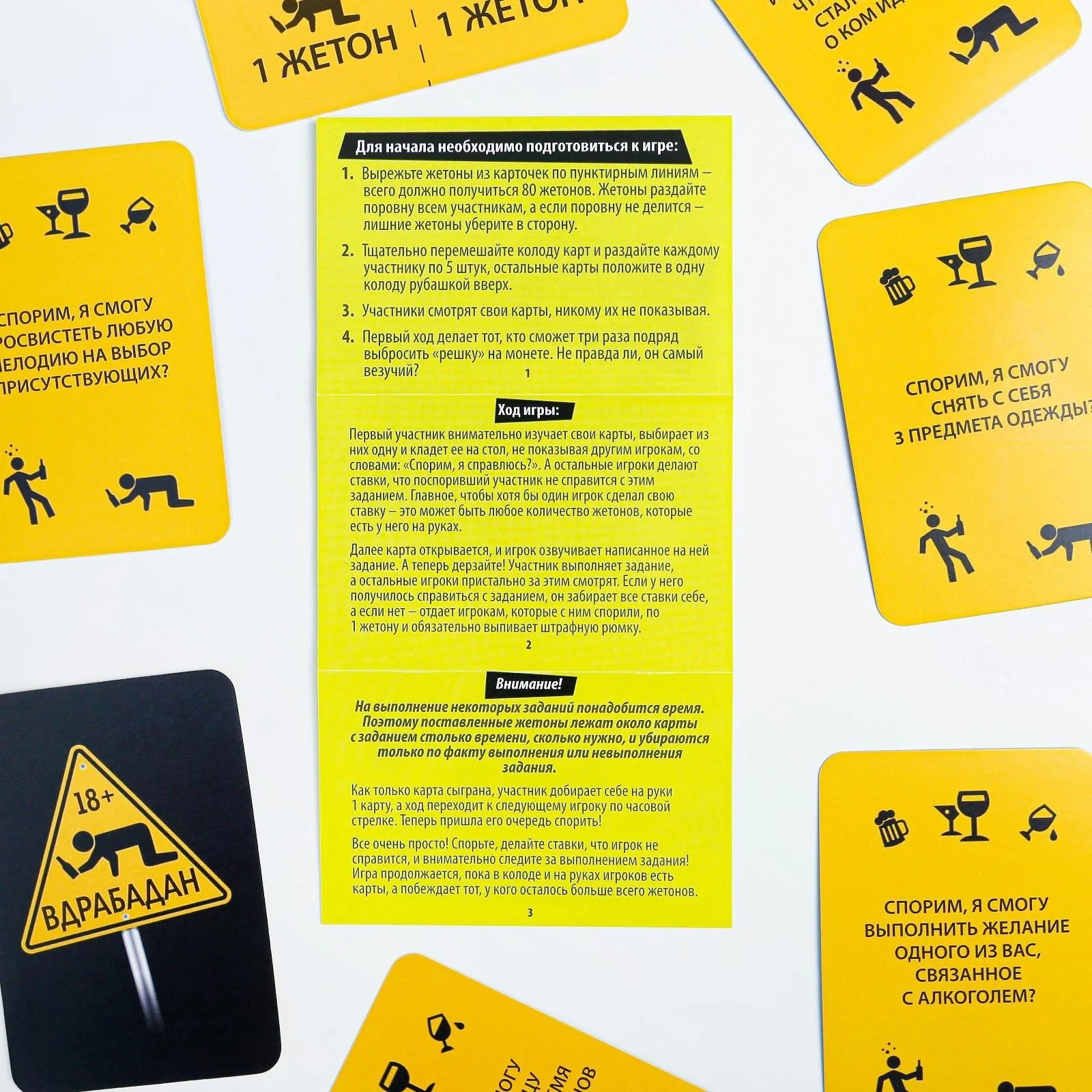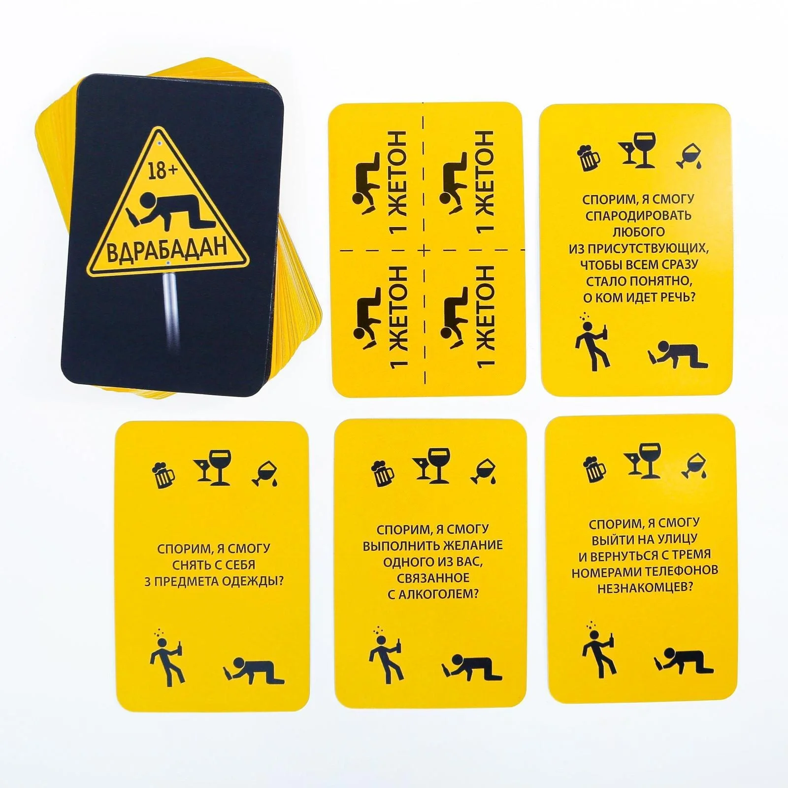You are waiting for outdoor tasks!Play very simple! Choose a card from your deck and with the words "bet I can handle it?" put it on the table. The rest of the players bet whether you can do the job or not. Did you? Well done! Take all the other players! And if not, then you give everyone a badge and, of course, drink a penalty!