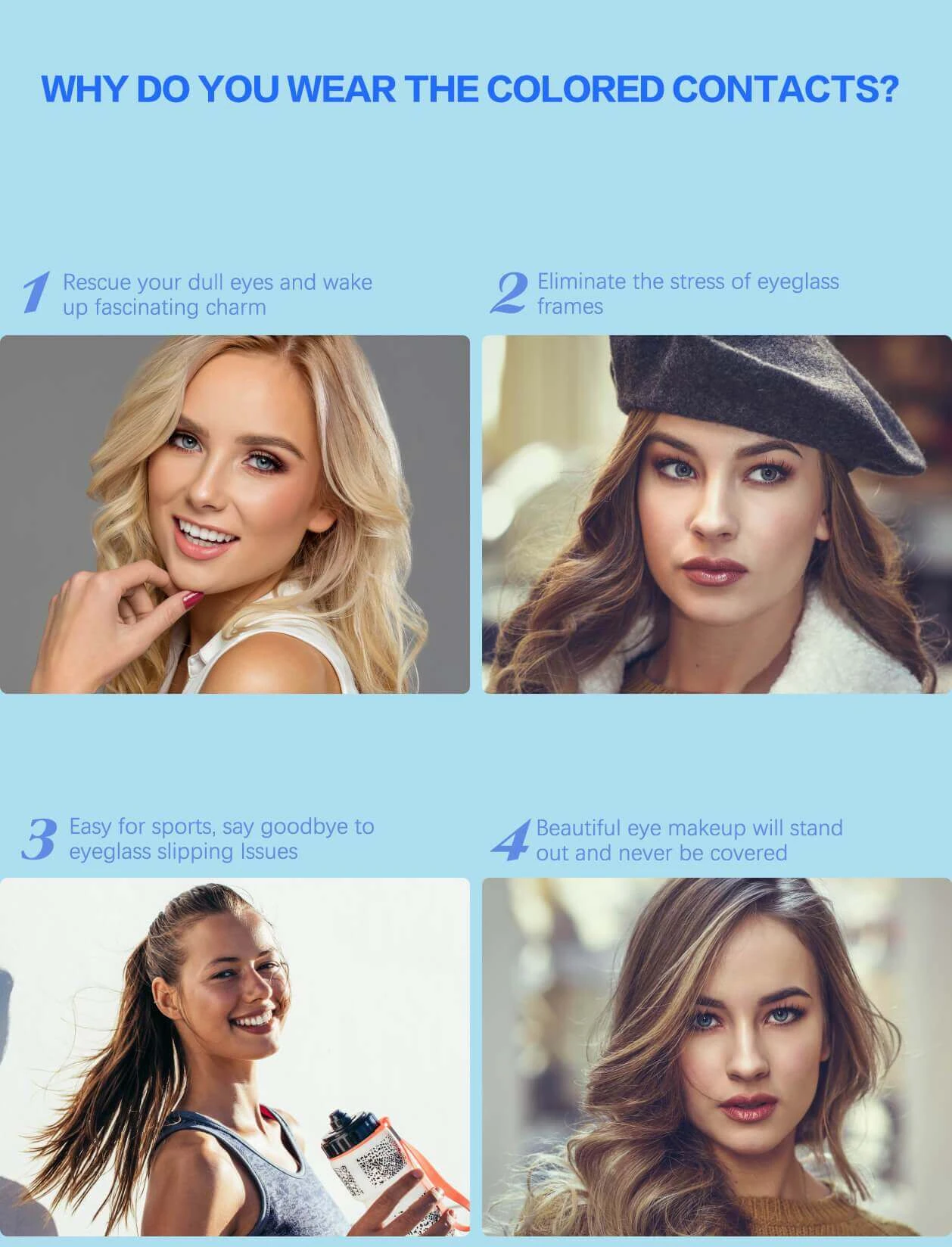 Из-за различных факторов, таких как светильник, фильтры для объектива камеры, окружающие цвета, оригинальный цвет глаз/форма глаз/макияж и т. д., цвет линз может отличаться и выглядеть по-разному. Такие случаи должны быть приемлемыми.