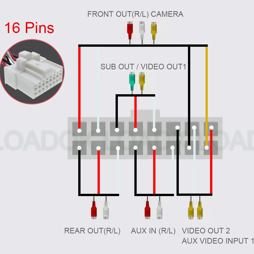 16Pin RCA жгут: Аудио AUX вход, SUB НЧ-динамик вход.