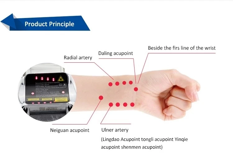 Принимает лазер низкой интенсивности с длиной волны 650 нм, через неинвазивное облучение кровеносных сосудов человеческого тела (радиальная артерия, Neiguan акупунктурная точка, акупунктура, локтевая артерия и полость носа)