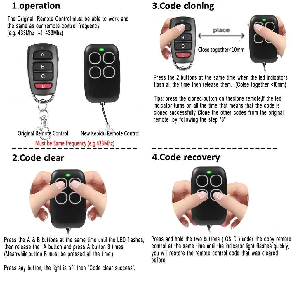 ИнструкцияШаг 1: Перед копированием необходимо сначала очистить код. Одновременно нажмите на две кнопки дубликатора, затем индикатор начнет мигать. Это означает, что код успешно очищен.Шаг 2: Нажмите кнопку многочастотного дубликатора и оригинального зашифрованного дистанционного управления соответственно, одновременно или последовательно, и удерживайте нажатие. Индикатор многочастотного дубликатора будет мигать 2-3 раза постоянно, и будет включен, затем отпустите его, скопируйте успешно, скопируйте другие коды, следуя этому шагуСовет: Нажмите кнопку клонирования на пульте клонирования, если светодиодный индикатор постоянно включается, это означаетЧто код успешно клонирован. Клонируйте другие коды с оригинального пульта ДУ, следуяШаг "3Восстановление:Если вы стираете код по ошибке, не волнуйтесь, мы можем восстановить его, нажав на кнопку C & D в то же времяВремя немного дольше, когда светодиод мигает, коды отключаютсяПереключение дистанционного управления channe:1. Удерживайте нажатие кнопки «BC» одновременно, когда зеленый индикатор мигает, затем Переключитесь наВторой пульт дистанционного управления, отпустите их, затем он работает;2. Удерживайте нажатие кнопки «BC» в то же время снова, когда синий индикатор мигает, затем переключитесь назад наПервый пульт дистанционного управления по умолчанию.3. Примечание: рабочий статус двух пультов дистанционного управления не влияет друг на друга.