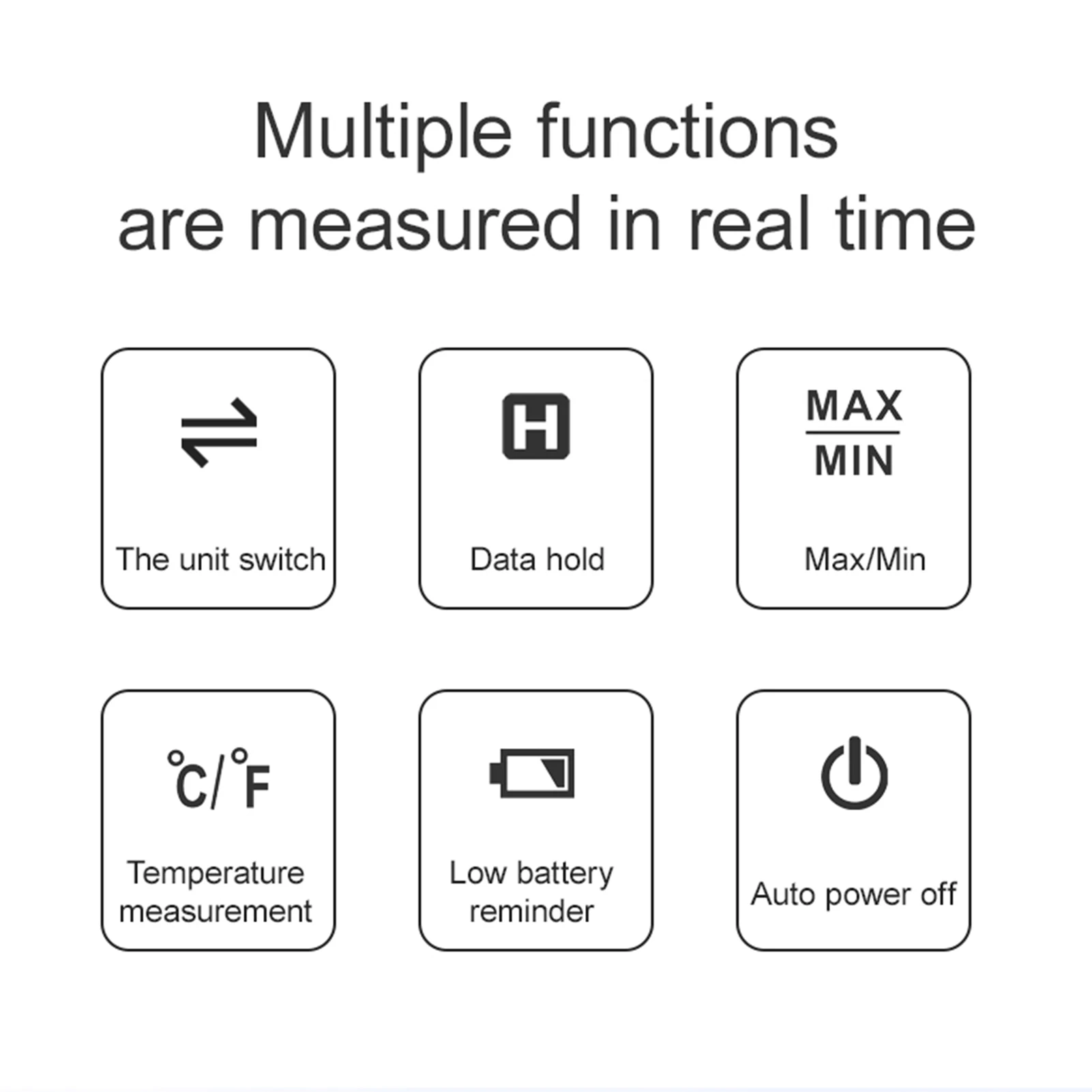 Больше функций анемометра: Функция удержания данных, может удерживать чтение; Максимальная/минимальная/AVG функция, она покажет самое Высокое/низкое/среднее считывание на дисплее; руководство/Автоматическое выключение питания опционально; Индикация низкого заряда батареи.