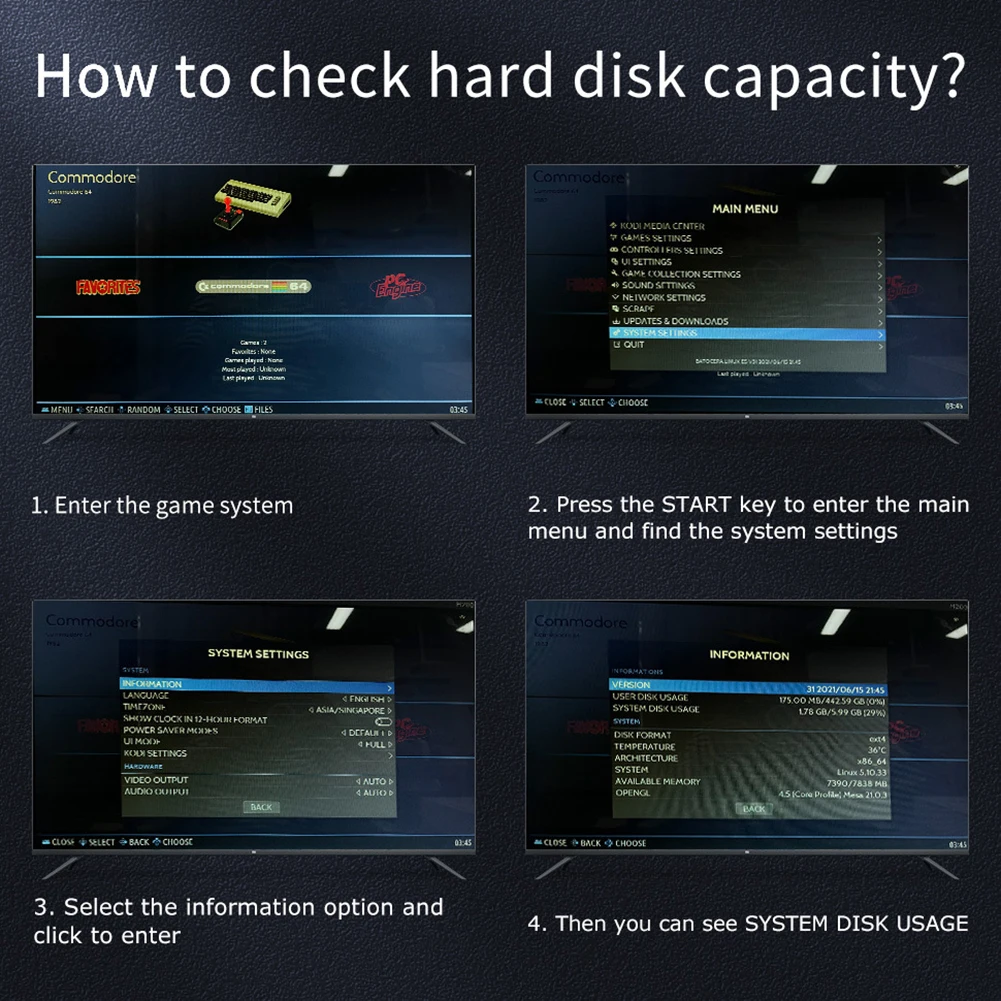 5. Как проверить Емкость жесткого диска:Введите игровую систему; Нажмите кнопку «Пуск», чтобы войти в главное меню, чтобы найти системные настройки; Выберите «Информация» и нажмите, чтобы войти; затем вы можете увидеть использование системного диска. PS: поскольку система жесткого диска является системой Linux, система Windows не может видеть раздел игры, поэтому жесткий диск не может быть виден в системе Windows. Вы можете войти в игровую систему для просмотра.