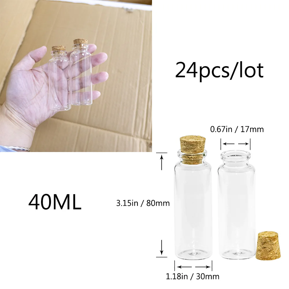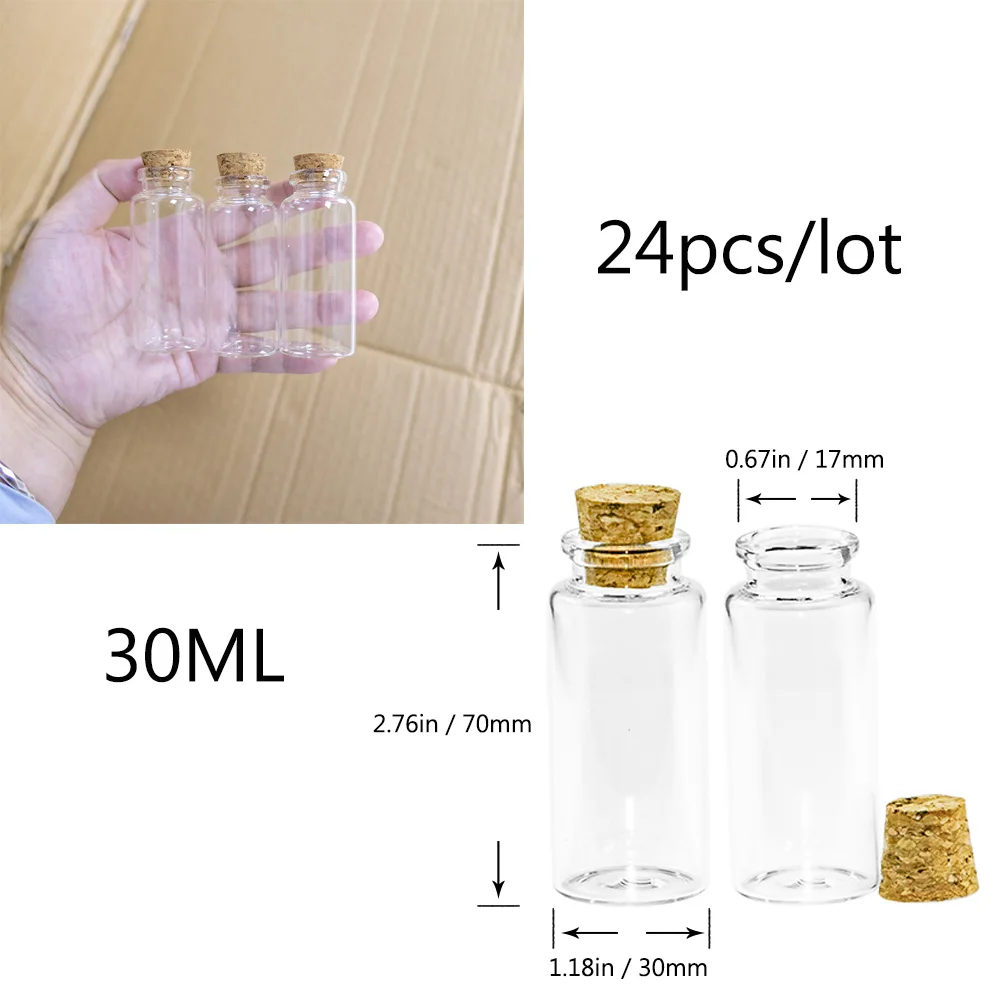 Количество:24 предметаПрозрачные стеклянные бутылки с пробкамиИспользование: стеклянные бутылки, флаконы для духов, Mini Arts Jas, Цветные бутылки, подвески в форме бутылочек, стеклянные бутылки с пробковой пробкой, бутылки желаний, Подарочные маленькие бутылки баночки бутылочки