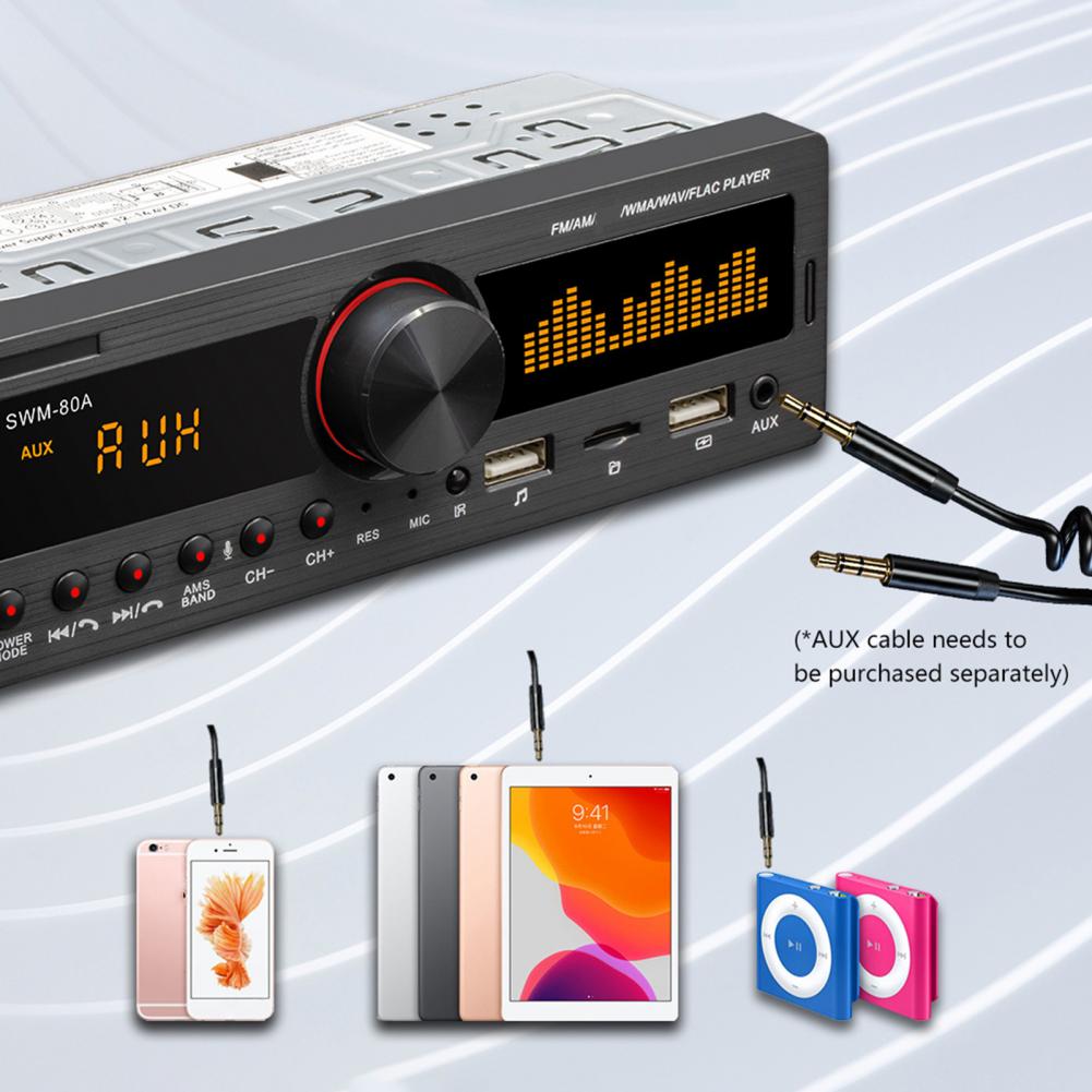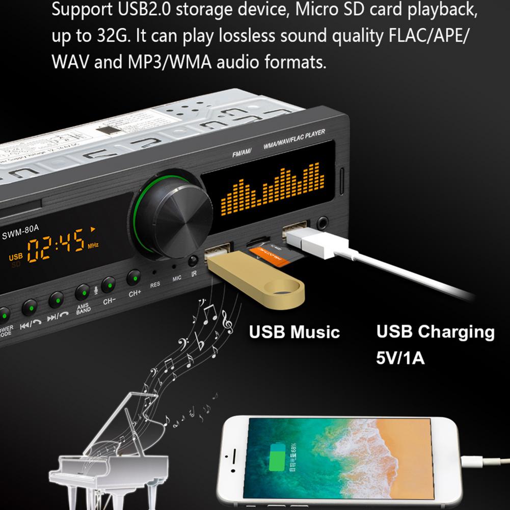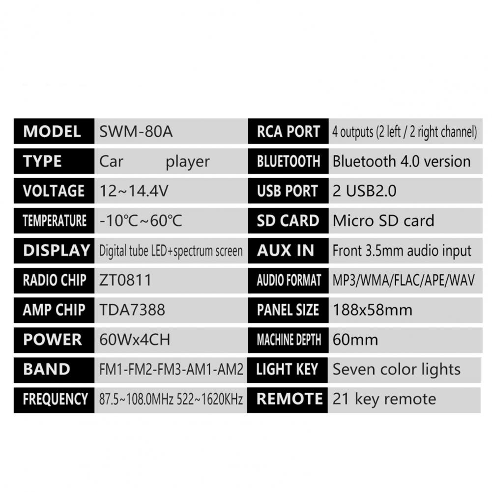 Вы можете получить несколько функций, включая функцию радио (FM/AM), чтение u-диска/карты, функцию AUX, функцию Bluetooth, аудиовыход RCA (можно подключить к сабвуферу), мобильный телефон голосовой помощник (голосовое управление), функция копирования аудио источника и красочные огни.