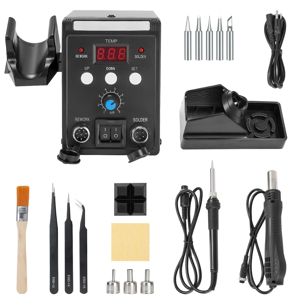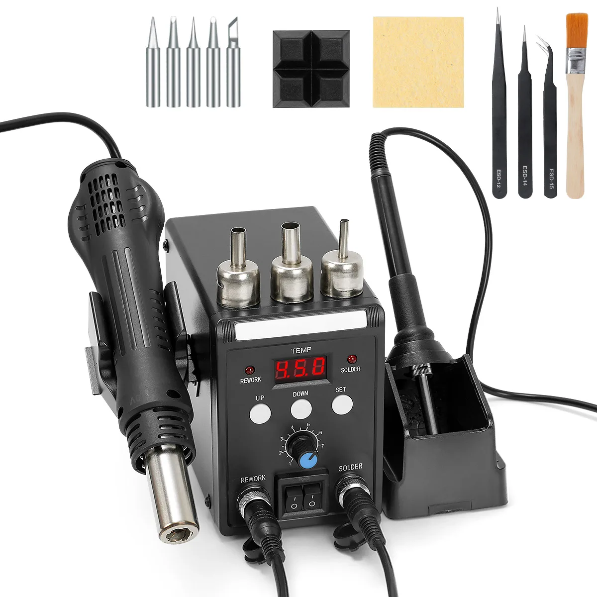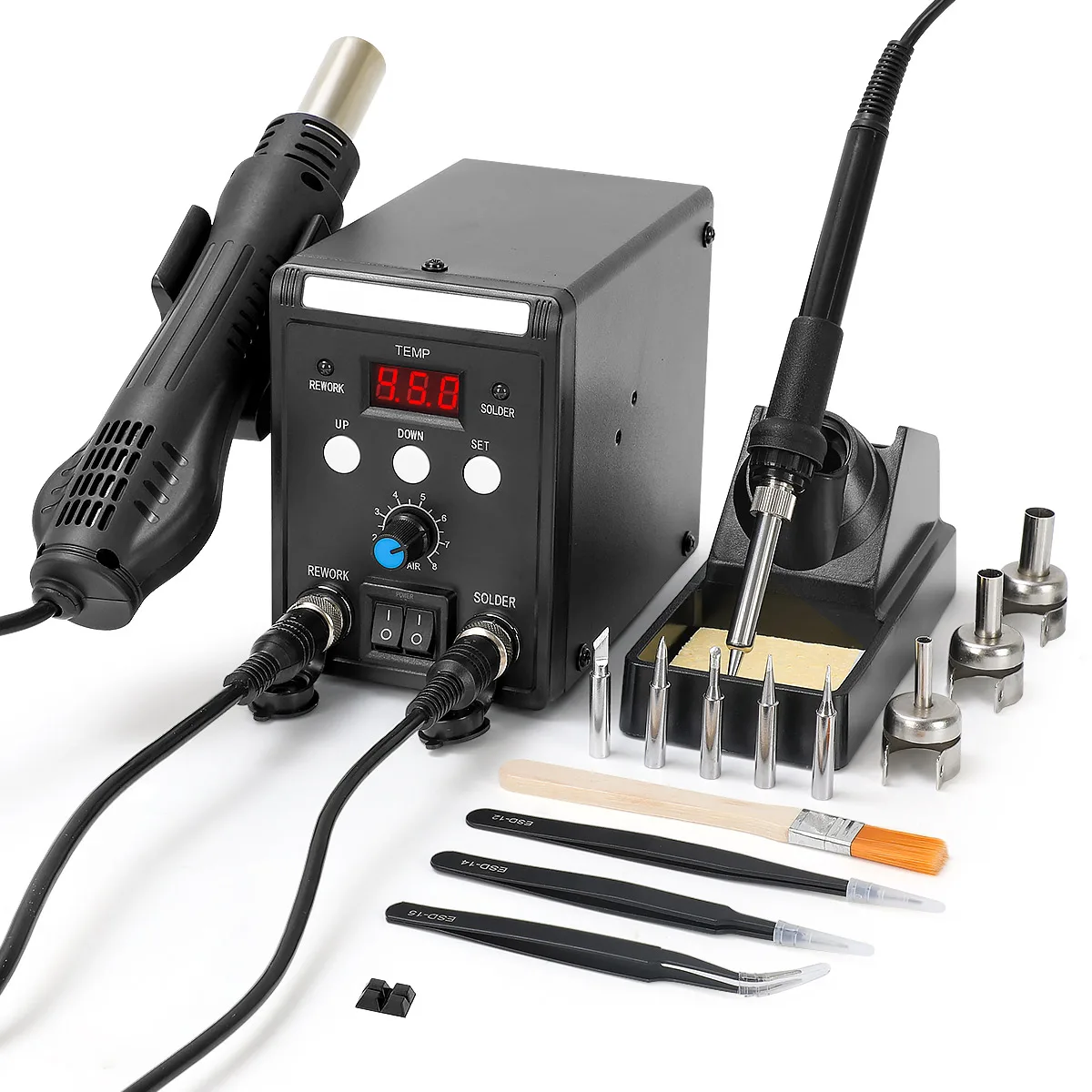 Паяльная станция 2в1 с горячим воздухом и горячим утюгом;