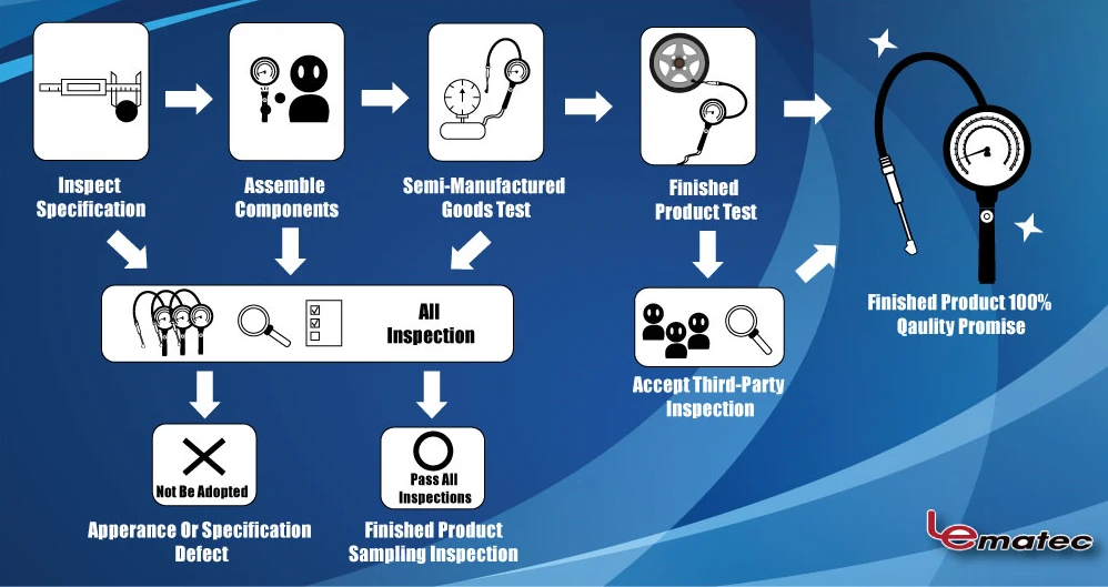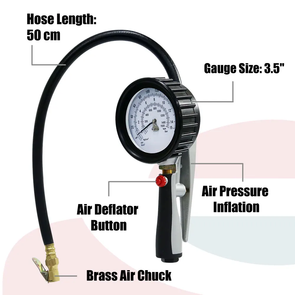 (1) Air Pressure Inflation. (2) Air Pressure Release. (3) Heavy Duty Made. (4) Made in Taiwan. (5) Accurate. (6) Diaphragm Pressure Gauge.