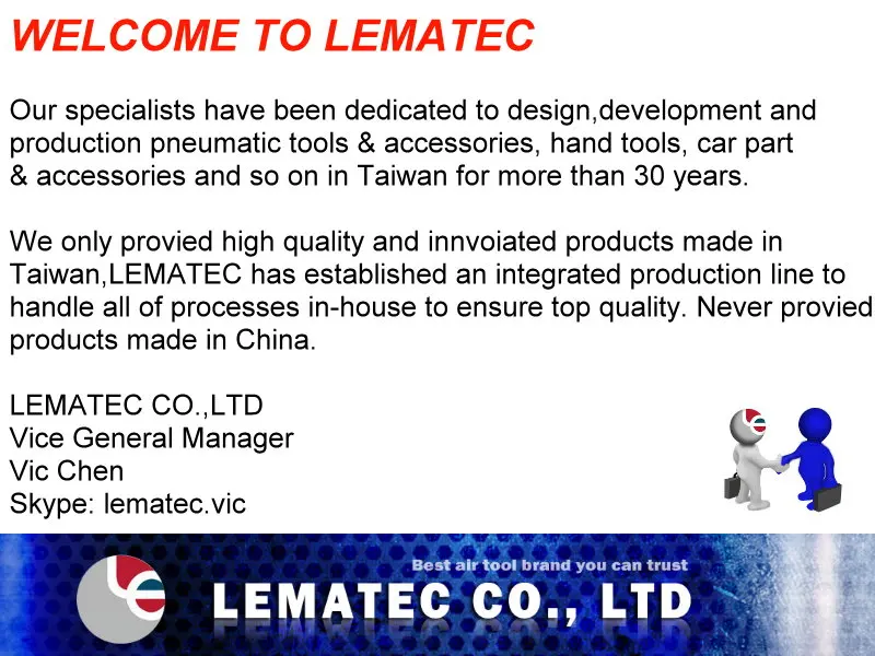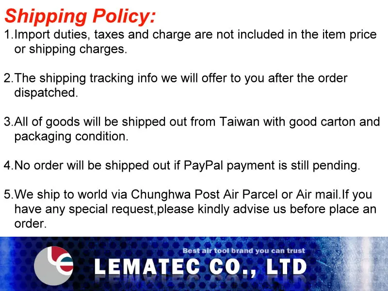 Model Number:TIG-07 Type:Heavy Duty Profession Material:ZINC & TPR Pressure range: 0~220 PSI,0~15 bar Weight:1.05 kgs Operating Pressure:90 PSI. Air Flow at 100 PSI:12 CFM Air inlet:1/4" Hose length:50 cm Size:23.0 * 9.0 * 25.0 cm Made in Taiwan