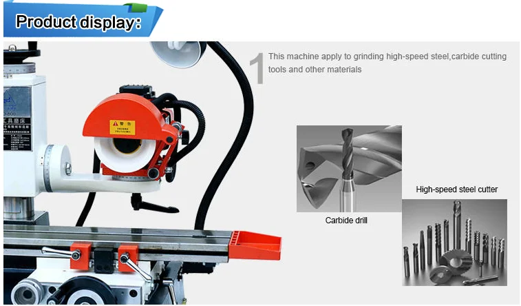 2.Машина может сочетаться с различными фитингами в линии с инструментами для измельчения, чтобы Измельчить сверло, винтовой кран, конец-Фреза. R-shaped токарный инструмент, R-shaped фреза, хобблинг нож, круглый нож для резки бумаги.