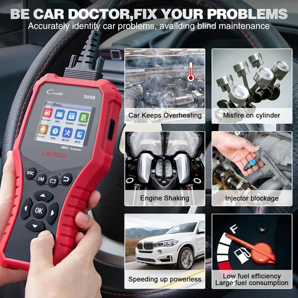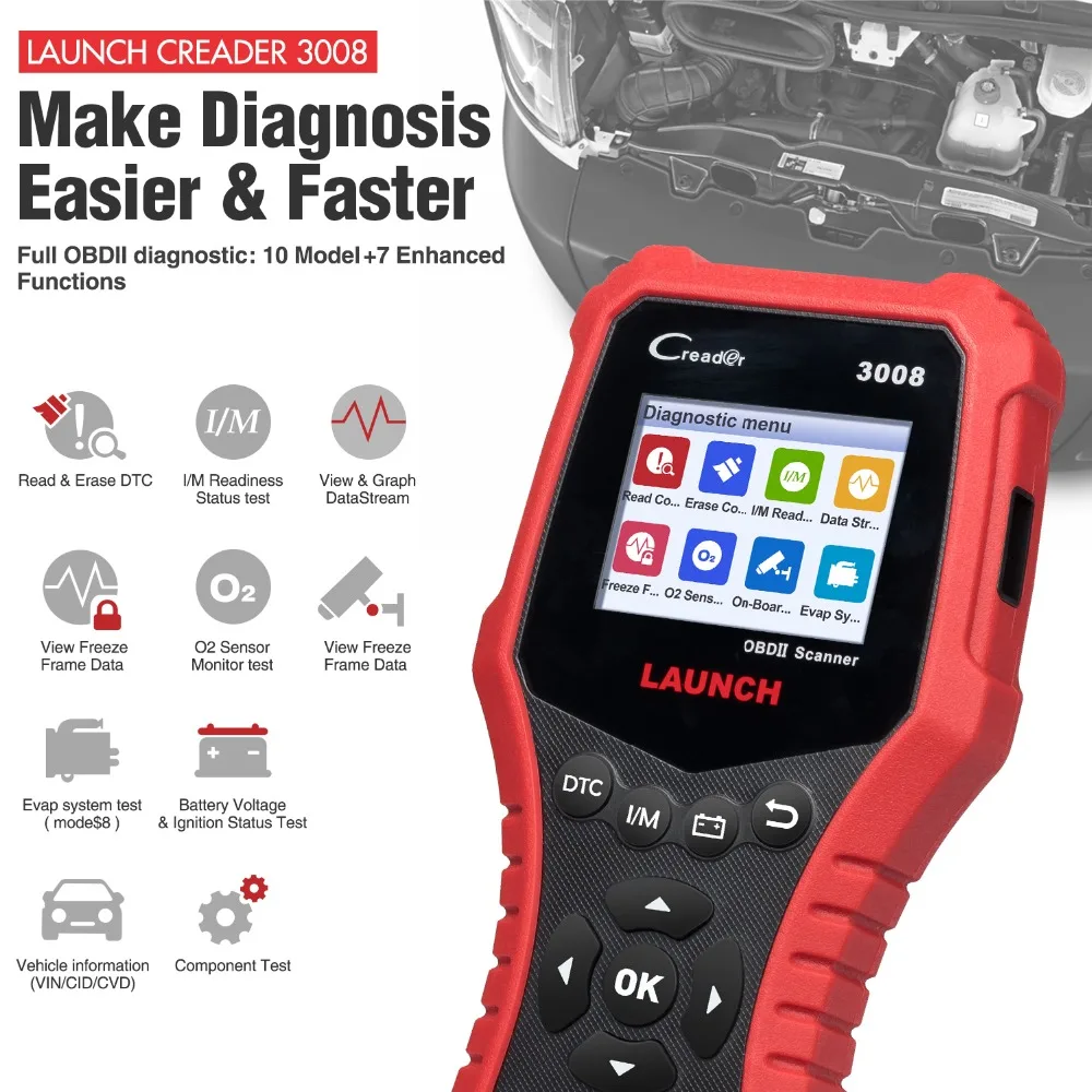 LAUNCH CR3008 OBD2 автомобильный диагностический сканер-универсальный диагностический инструмент для нескольких транспортных средств, поддерживает все 10 режимов тестирования OBDII на всех совместимых с OBDII транспортных средствах для полной диагностики. Благодаря уникальному запатентованному нажатию кнопки I/M готовности, цветному экрану и контролю напряжения батареи в реальном времени, запуск CR3008 действительно является конечной мощностью и доступностью, позволяет пользователям быстрее выполнять свою работу.