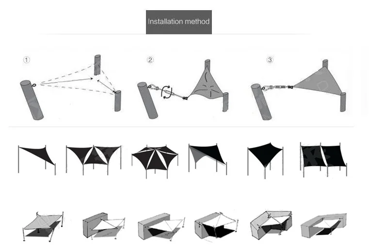 1, прежде всего, планировали место установки и определили фиксированный болт 2, а затем фиксированный теневой парус на каждый угол 3. Завершите установку Примечание: При установке, Пожалуйста, полностью Используйте окружающие здания, Такие как стены, дома, деревья, телефонные столбы, С веревкой, фиксированной плотно.