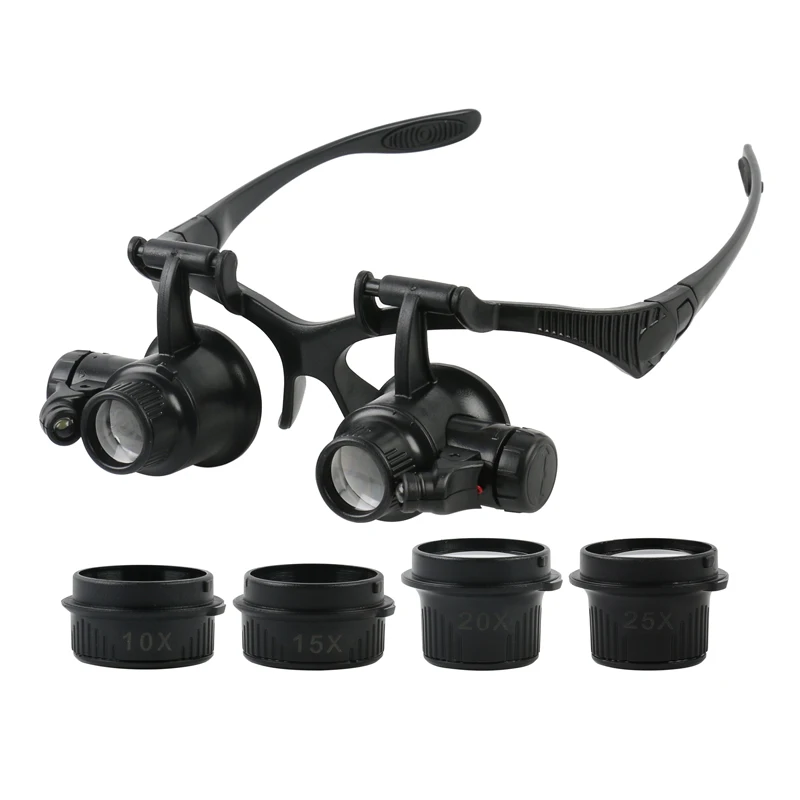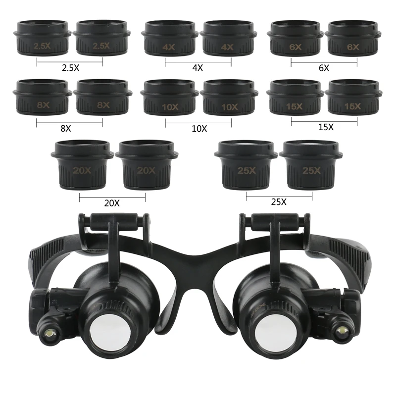 Увеличительное стекло для глаз ремонт часов Лупа ювелира увеличительное стекло Характеристика: 1 идеальная бинокулярная Лупа увеличительное стекло для электронных инженеров, любителей, коллекционеров, учёных и студентов 2 для полиграфической промышленности и контроля качества бумаги 3 для обслуживания сада 4. Проверьте скрытые функции безопасности на банкнотах и паспортах 5 Проверьте водяные знаки и полосы безопасности 6. Проверка качества бумажных документов 7 для осмотра растений, животных 8 для мини-проверки и ремонта цепи 9 идеальный подарок для семьи, друзей и делового бренда Часы Ремонт лупа очки увеличительное 10x,15x,20x,25x Multipower С 2 светодиодный светильник С ободок со сменными лентами Размеры: 200*145*20 мм (рама), Диаметр линзы: 21 мм Материал: акрил, АБС-пластик, светодиод Увеличение: 2.5X, 4X, 6X, 8X, 10X,15X,20X,25X Линзы: 8 пар круглых линз и 2 окуляра Светильник: 2 белый светильник светодиодный Батарея: 6 LR1130 (не входит в комплект для безопасности) Посылка включает в себя: 1 x набор увеличительного стекла