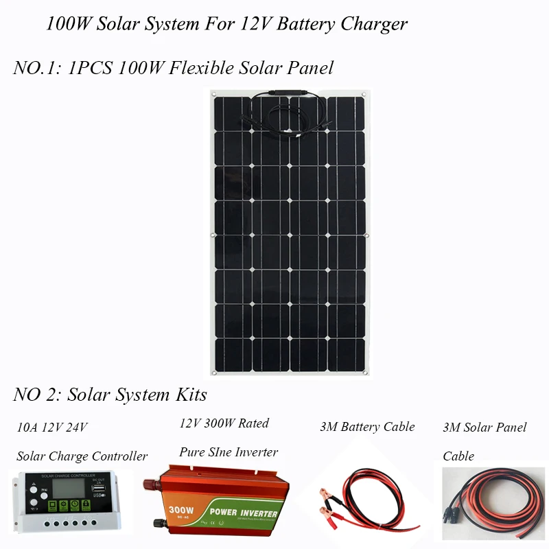 Гибкая солнечная панель 100 Вт, 1 шт.; Размер: 1050 мм * 540 мм * 2,5 мм. 10A, 12V/24V Авто ЖК-дисплей ШИМ-контроллер заряда солнечного аккумулятора; 1 шт. 3 м Удлинительный Солнечный Кабель; Красный и черный; 1 комплект; 3 м Солнечный Кабель с зажимом аллигатора; 1 комплект 1 пара коннекторов типа Y 1000w 12V = 220VAC инвертор
