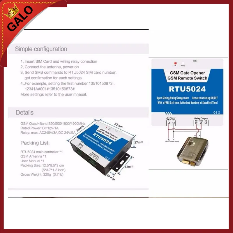 1. Четырехдиапазонный, может работать в сетях GSM по всему миру; 2. Никаких звонков. TheGSM открывалка ворот/реле отклоняет вызов от авторизованного номера, затем осуществляет включение/выключение действия на первом 'ring'; 3. Несколько применений. (ворота, болты, барьеры, гаражные двери, ставни и двери доступа или машины); 4. Безопасный Идентификатор вызывающего абонента для идентификации, неизвестные абоненты игнорируются; 5. Может работать из любого места, без ограничения расстояния; 6. Добавьте или удалите пользователей с помощью sms-команды; 7. Нет необходимости предоставлять пульт дистанционного управления или ключи для разных пользователей; 8. В указанное время могут быть настроены до 200 авторизованных телефонных номеров; 9. Один выход с релейной оценкой 3A/240VAC для подключения выключателя двери или машины; 10. Действие реле вернет подтверждение SMS владельцу или авторизованному номеру вызова, эта функция редактируется пользователем; 11. Реле закрывается или открывается время программируется; 12. На основе GSM сети, применяется для многих приложений.