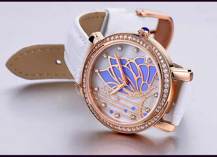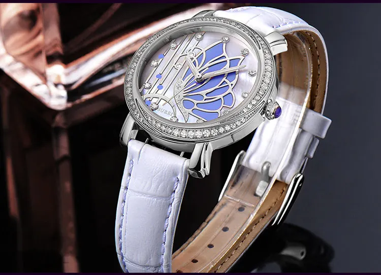 особенности: 30 м водонепроницаемый, сапфир зеркало, импортные кварцевый механизм, ремень из натуральной кожи, рамка из нержавеющей стали инкрустация стразами, горный хрусталь масштаб. бабочки поверхность.