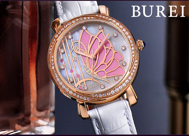 BUREI Роскошные Модные Женские Часы Кожаный Ремешок Аналоговые Кварцевые Водонепроницаемые Наручные Часы Леди Горный Хрусталь Случайные Часы Feminino