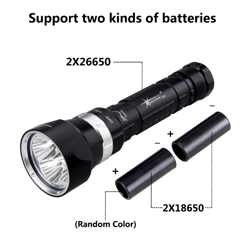 Выход яркий может достигать более 6000 люменов [лм] Внутренняя проводка применяет высокоэффективный усилитель цепи, и может использовать батареи в большой степени Корпус этого фонарика изготовлен из авиационного алюминиевого сплава и имеет очень прочную конструкцию. Жесткая анодированная отделка; Анти-абразивный, не царапается, ударопрочный. Ультраглубокий Противоскользящий эффект trench structuresi отлично подходит для дайвинга В этом фонарике используется текстурированный отражатель (а не гладкий отражатель). Луч из текстурированного отражателя более ровный, с более постепенным переходом между горячим пятном (центром пучка) и разливом (периферией пучка). Тип эмиттера: XM-L U2 светодиодный Светильник Цвет: белый Светодиодный Количество: 4 Водонепроницаемость: под водой 100 метров Конфигурация батареи: 2x18650 или 2x18650 Напряжение Вход: 8,4 v Переключатель Тип: твист Количество режимов: Низкий> Высокий> Стро Режим: постепенно увеличивать яркость Яркость: 6000 люмен Максимальная яркость Светодиодный срок службы: 100000 часов Материал: Алюминий Объектив: стеклянный объектив с покрытием Отражатель: Алюминиевый текстурированный отражатель Корпус Цвет: черный Размер (мм):212 мм x 62 мм (головка) x 34 мм Вес: 382 г Перезаряжаемая батарея 18650 (красный цвет): Подходит для фонарика фонарь/налобный фонарь Ёмкость: 3600 мА-ч Напряжение: 3,7 V Батарея Зарядное устройство: Адаптер переменного тока легко складывается для зарядки и упаковки Умное зарядное устройство может заряжать литий-ионные аккумуляторы 18650, два за раз Подходит для литий-ионных аккумуляторов 18650 2 шт. Светодиодный индикатор для включения/зарядки/полной зарядки Измерение: ~ 8,4x4,6x3,3 см (Д * Ш * В) Вес: 72 г То, что посылка: 100% Фирменная Новинка 1x SolarStorm 6000Lm Дайвинг 4x XM-L U2 светодиодный фонарь 2x водонепроницаемое уплотнительное кольцо 2x18650 3,7 v 3000mAh перезаряжаемые батареи 1x Зарядное устройство 18650 (110-240 в мировое напряжение) 1x переходник для вашей страны