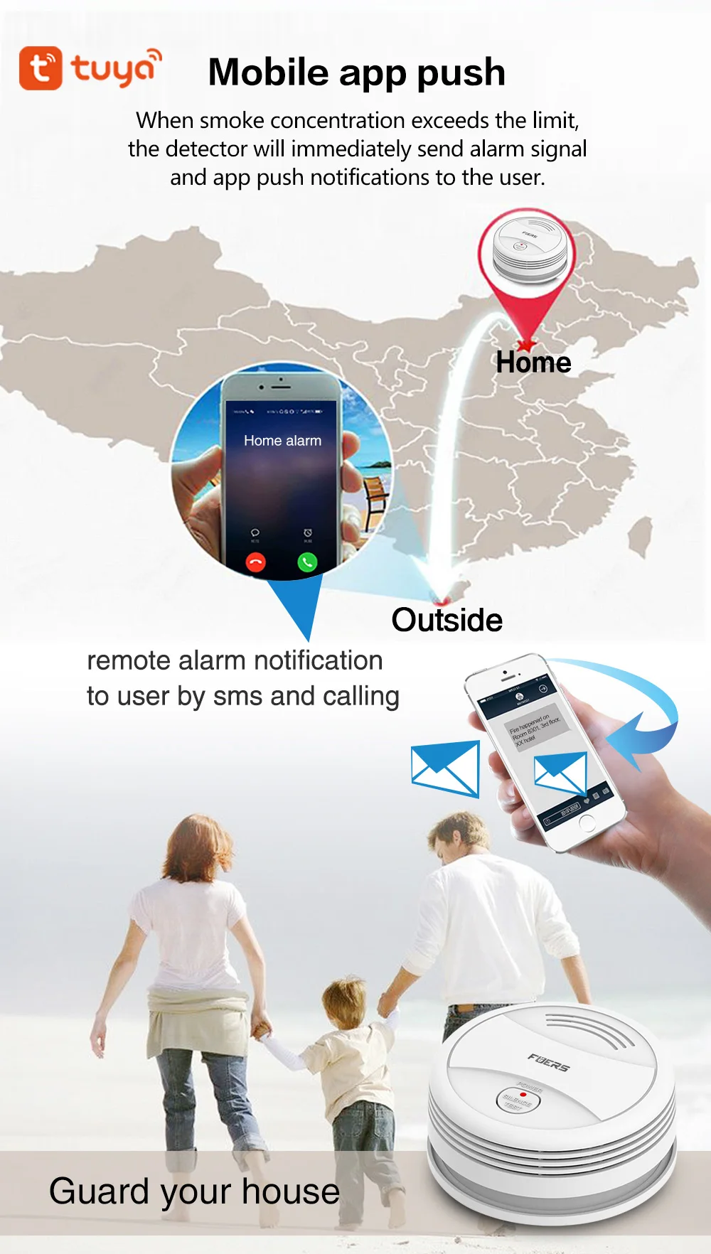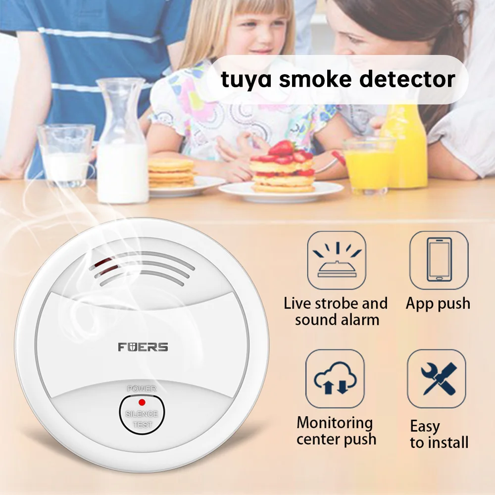Когда детектор обнаруживает дым, он будет нажимать информацию о тревоге на мобильный телефон через сеть Wi-Fi и проверять информацию о состоянии датчика в приложении «Tuya Smart» на мобильный телефон.