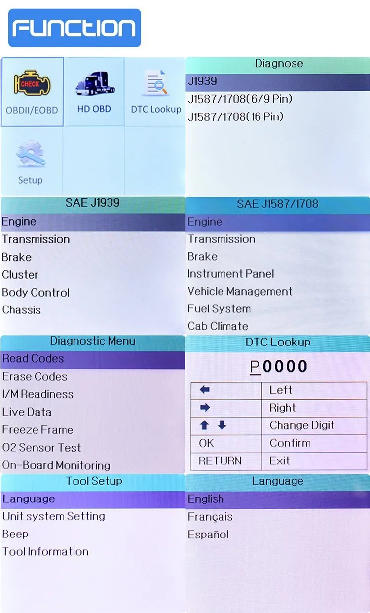 Для Cummings, для Детройта, для гусеницы, для Freightliner, для International, для Kenworth, для John Deere, forPeterbilt, для Sterling, для Mack, Для Mecedes Benz, для VOLVO, для Scania, для ISUZU, для Brilliance и более дизельных грузовиков; Поддержка грузовик с операционными системами: Двигатель, коробка передач, приборная панель, подъездной поезд, тормозная система, подвеска, ABS, ESP, EPS, топливная система и т. Д. Поддержка Легковые автомобили: Американская машина с 1996 года по настоящее время Европейский автомобиль с 2001 года по настоящее время Азиатский автомобиль с 2008 года по настоящее время Системы функции: Чтение кодов, коды стирания, четкость I/M, прямые данные, тест EVAP, Тест датчика O2... и т. Д.1. Модуль сканирования автомобиля
