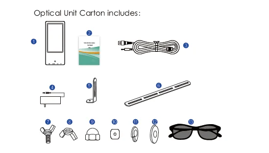 ① 3D Модулятор × 1 шт.② Руководство пользователя × 1 шт.③ Зарядное устройство DIN/мини-TRRS (3,5 мм) Синхронизация Cable× 1 шт.④ Motor× 1 шт.⑤ L-образное крепление × 1 шт.Bottom Нижняя платформа × 1 шт.Screwотвертка-бабочка × 3 шт.Wing крыло nut× 3 шт.Ball M6 мяч nut× 1 шт.⑩ Gasket× комплект из 2 предметов⑪ M6 пружина pad× 1 шт⑫ M6 gasket× 1 шт.⑬ Круглые поляризационные стекла × 2 шт.
