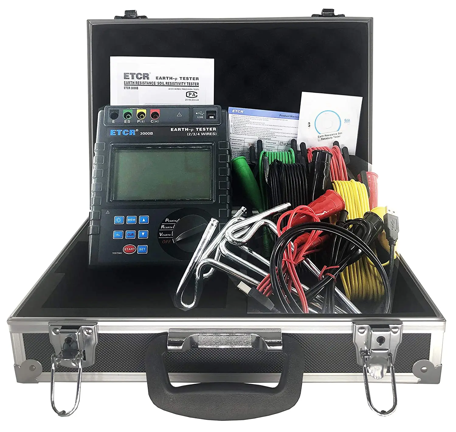ETCR3000B Измеритель сопротивления грунту состоит из хост-машины, программного обеспечения мониторинга, испытательных проводов, вспомогательных опорных столбов, проводов связи и других. Большой ЖК-дисплей хост-машины с синей подсветкой и гистограммой, показывающей, что можно четко видеть.