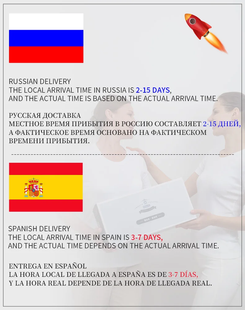 Доставка из Испании, России и Китая, чтобы вы быстро получили прекрасный товар.