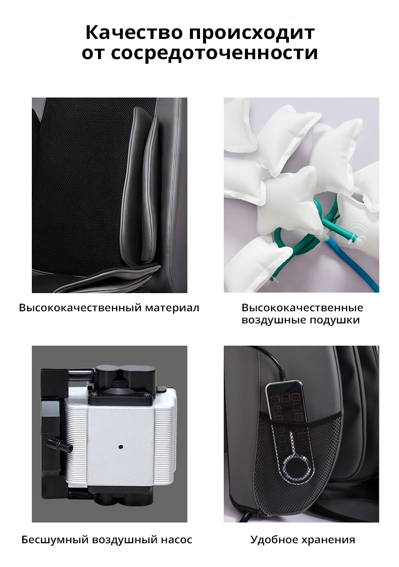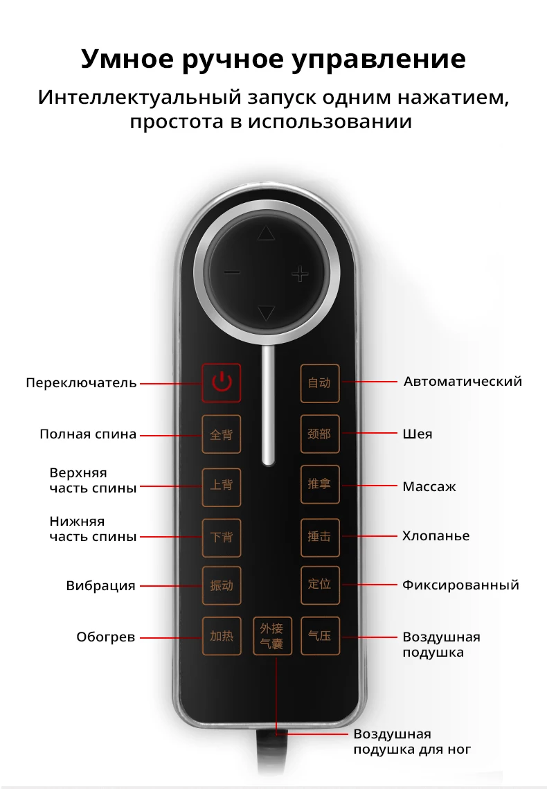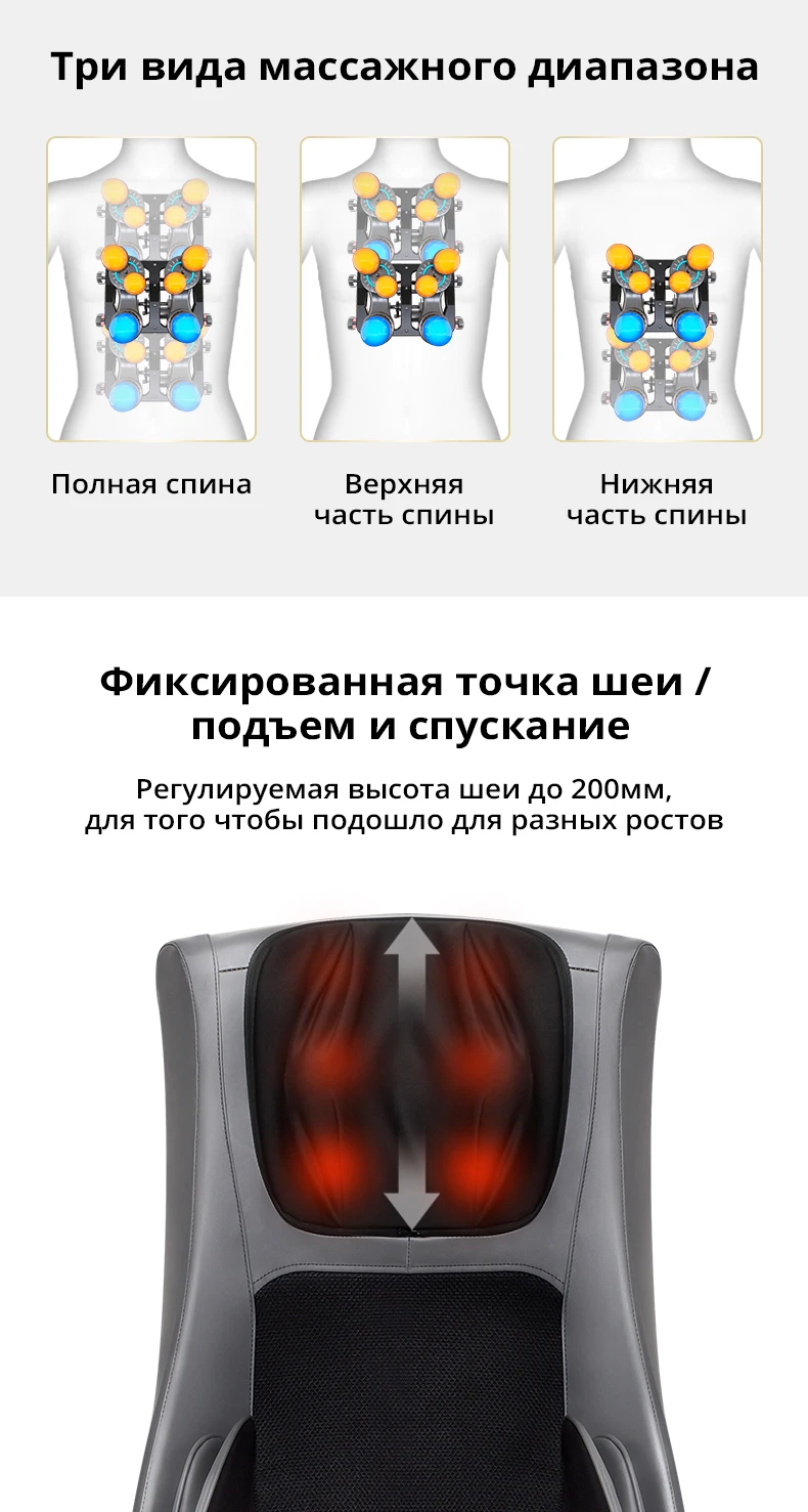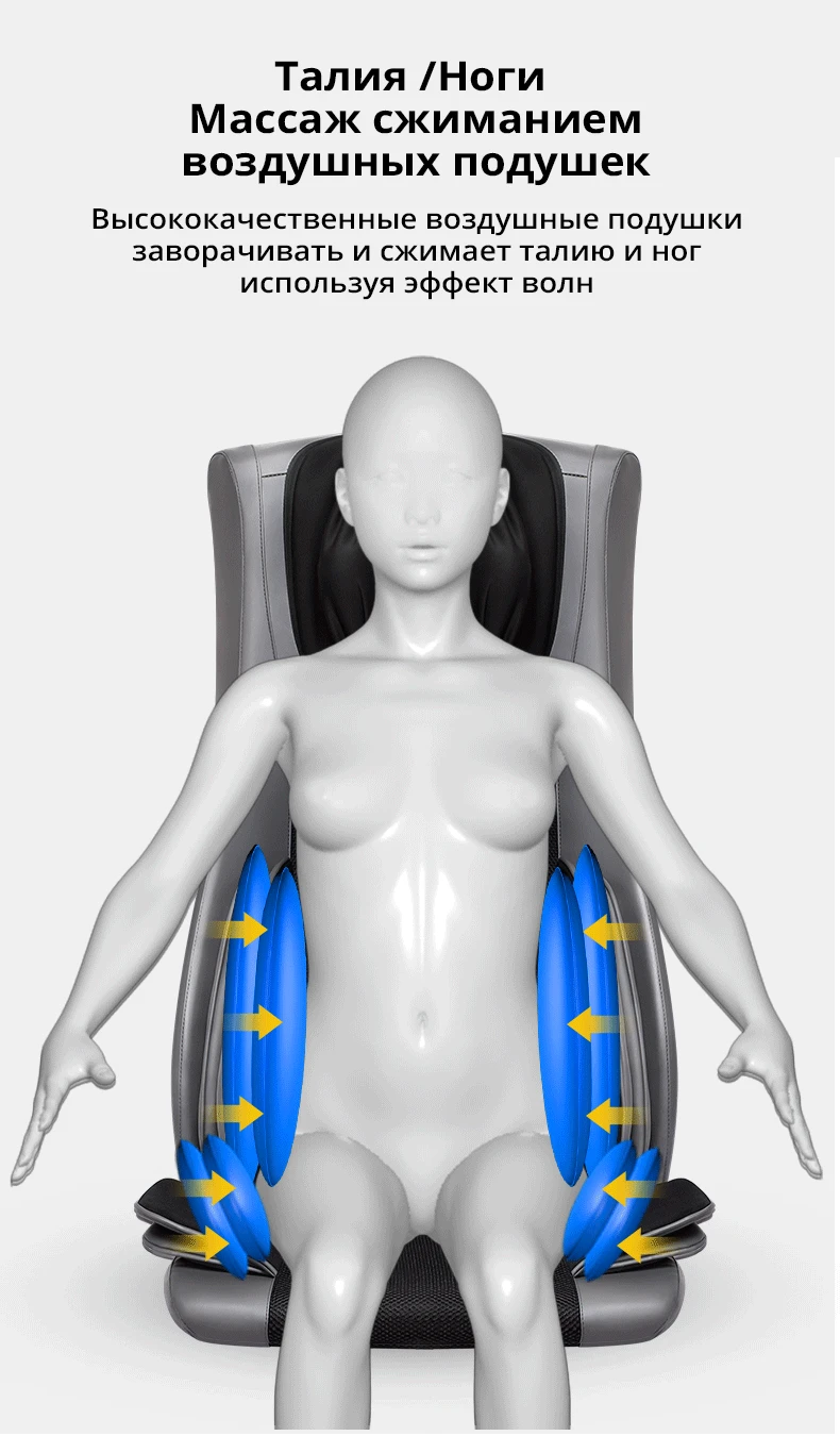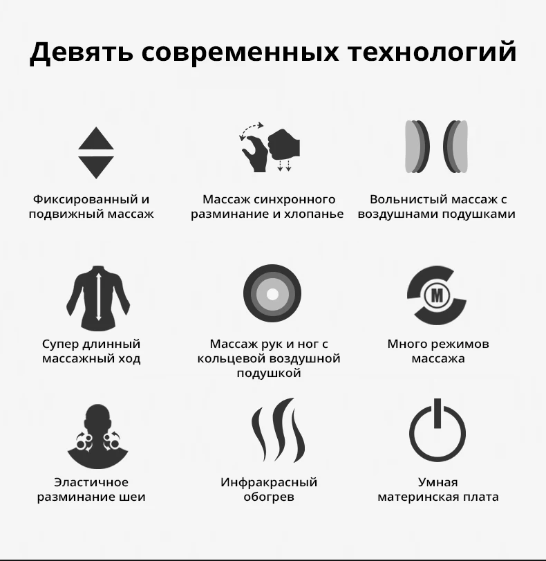 * С фиксацией и подвижной массаж * Разминание синхронизированный откидные массаж * Подушка безопасности волна стиль массаж * Супер Длинные массаж ход * Руки и ноги кольцо воздушная подушка массаж * Много режимов массажа * Шейный эластичный разминание * Инфракрасная нагревательная * Смарт материнская плата