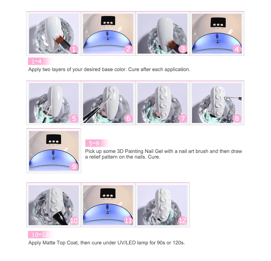 Шаг 2. Возьмите 3d-гель для ногтей с помощью кисти для дизайна ногтей, а затем сделайте 2D или 3D дизайн ногтей на ногтях. Лечение.