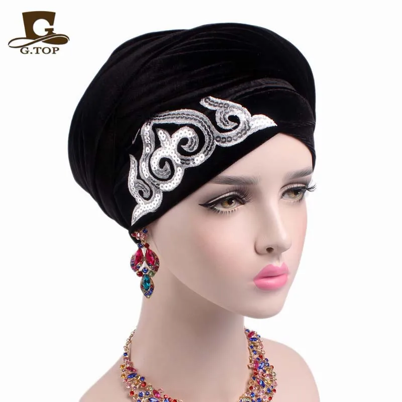 TJM-38E, женские великолепные Украшенные блестками длинные бархатные мусульманский тюрбан, женские головные платки, роскошный хиджаб, однотонный цветной головной убор, Turbante