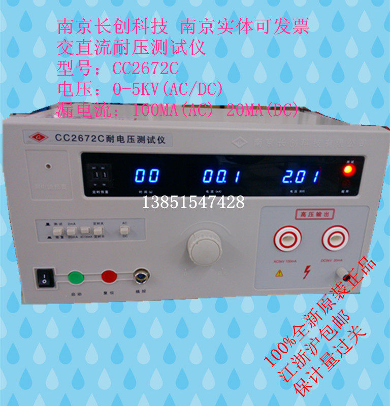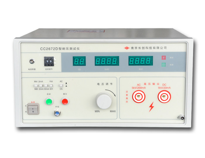 Название продукта: CC2672D Тестер давления Испытательное напряжение: (AC/DC): от 0 до 5 кВ ± 5% Ток утечки: (переменный ток): 0 ~ 2/20/200mA ± 5% (DC): 0 ~ 2/20mA ± 5% Время: от 0 до 99 секунд; Ручное управление Выходная мощность: (Pmax): 1000VA Мощность трансформатора: 1500VA