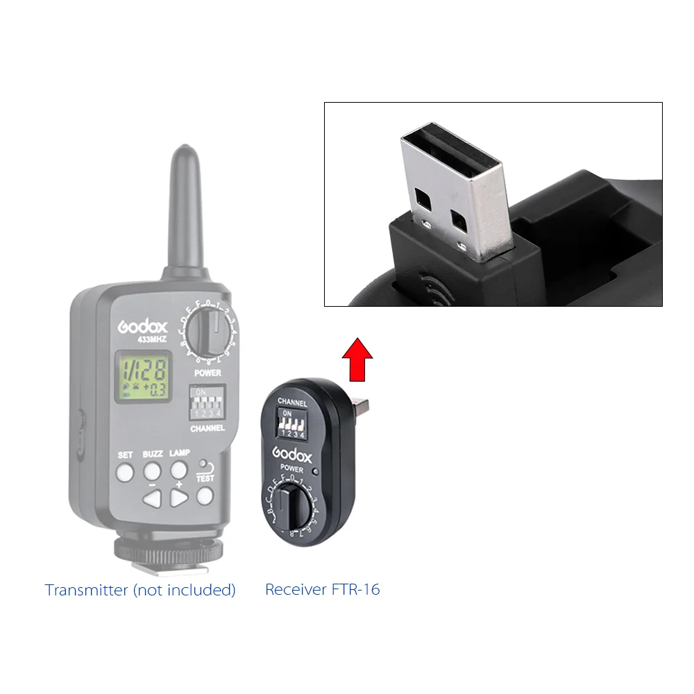 Этот беспроводной триггер-приемник Godox FTR-16 является частью «16-канального триггера вспышки Godox FT-16» и не может использоваться отдельно. С разными каналами, фотограф может спустить различные студийные вспышки под разными углами.