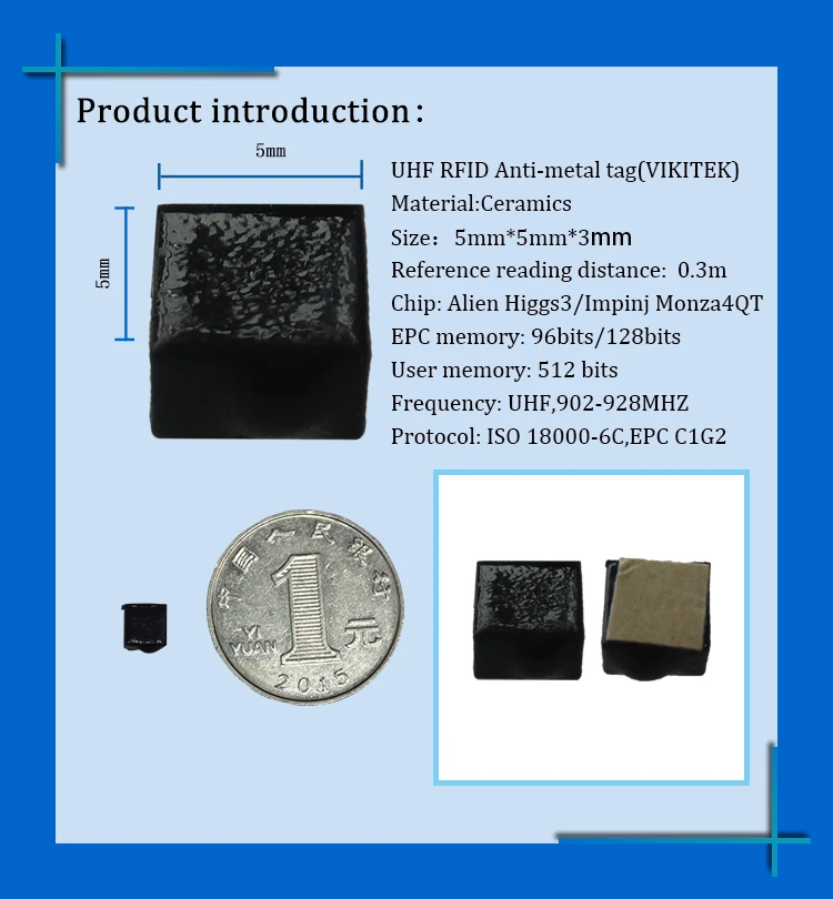 20 шт. UHF RFID Анти-металлический тег керамика Малый 6c пассивные теги 915 МГц Протокол: EPC класс 1 Gen2,ISO18000-6C Частота: UHF,902-928 МГц (можно настроить до 865-868 МГц) Размер: 5*5*3 мм Материал: керамика Чип: Alien Higgs3/Impinj Monza4QT Память EPC: 96 бит/128 бит Память пользователя: 512 бит Вес: 0,38 г Рабочая температура: от-30 ℃ до + 85 ℃ IP Рейтинг: IP65 Приблизительное расстояние чтения: 0,3 м