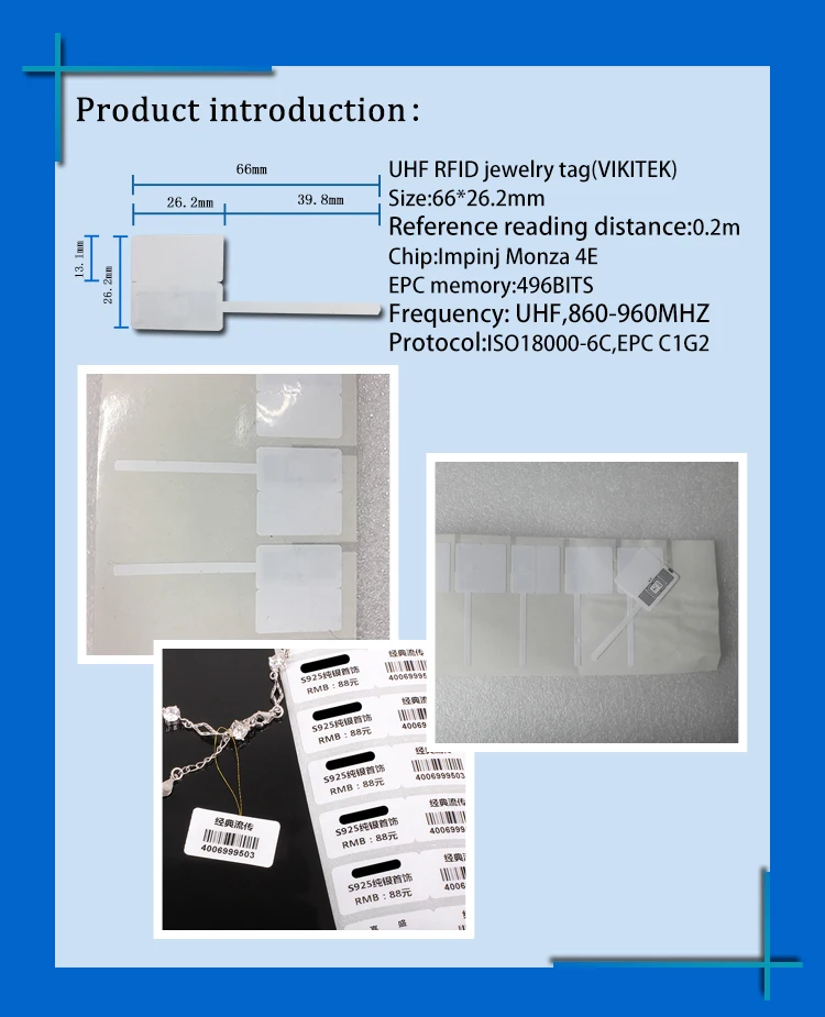 VIKITEK короткий диапазон ювелирных изделий Бирка UHF RFID стикер Самоклеющиеся 6c пассивная метка 915 МГц метка для чипа Размер: 66*26,2 мм Материал поверхности: ПЭТ Справочном расстояние: 0,2 м Чип: Impinj Monza4 Память EPC: 496 бит Память пользователя: 128 бит Частота: UHF,860-960 МГц Протокол: EPC C1G2,ISO18000-6C