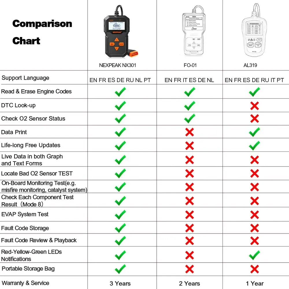 Новый сканер NEXPEAK NX301 OBD2 имеет уникальные запатентованные кнопки логической навигации, экран с TFT подсветкой и встроенный динамик. NEXPEAK NX301-это действительно конечная простота и доступная цена, позволяющая пользователям проверять ремонт, дорожное испытание, состояние проверки, состояние мониторинга выбросов и решать проблемы с системами двигателя и возможностями привода. Диагностические функции автомобиля NEXPEAK NX301 намного выше и полностью превосходят другие модели, такие как AD310 или NT201, по гораздо более доступной цене. Кроме того, NX301 поддерживает одно нажатие обновления и печать диагностических отчетов с ПК.